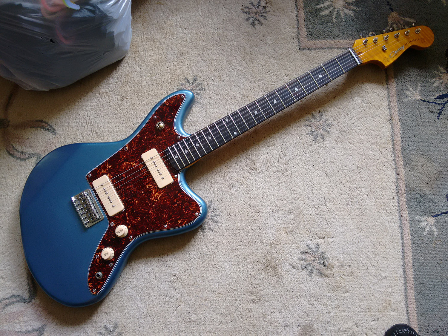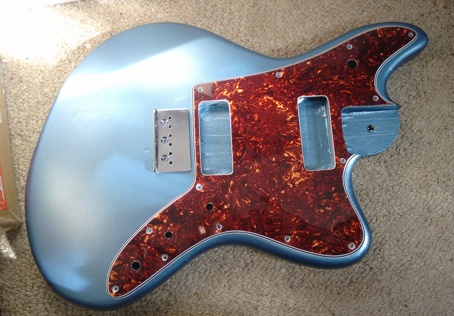 The re-filled tremolo rout and the filled in Jazzmaster style tremolo rout.