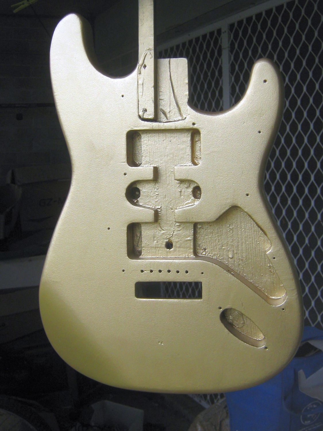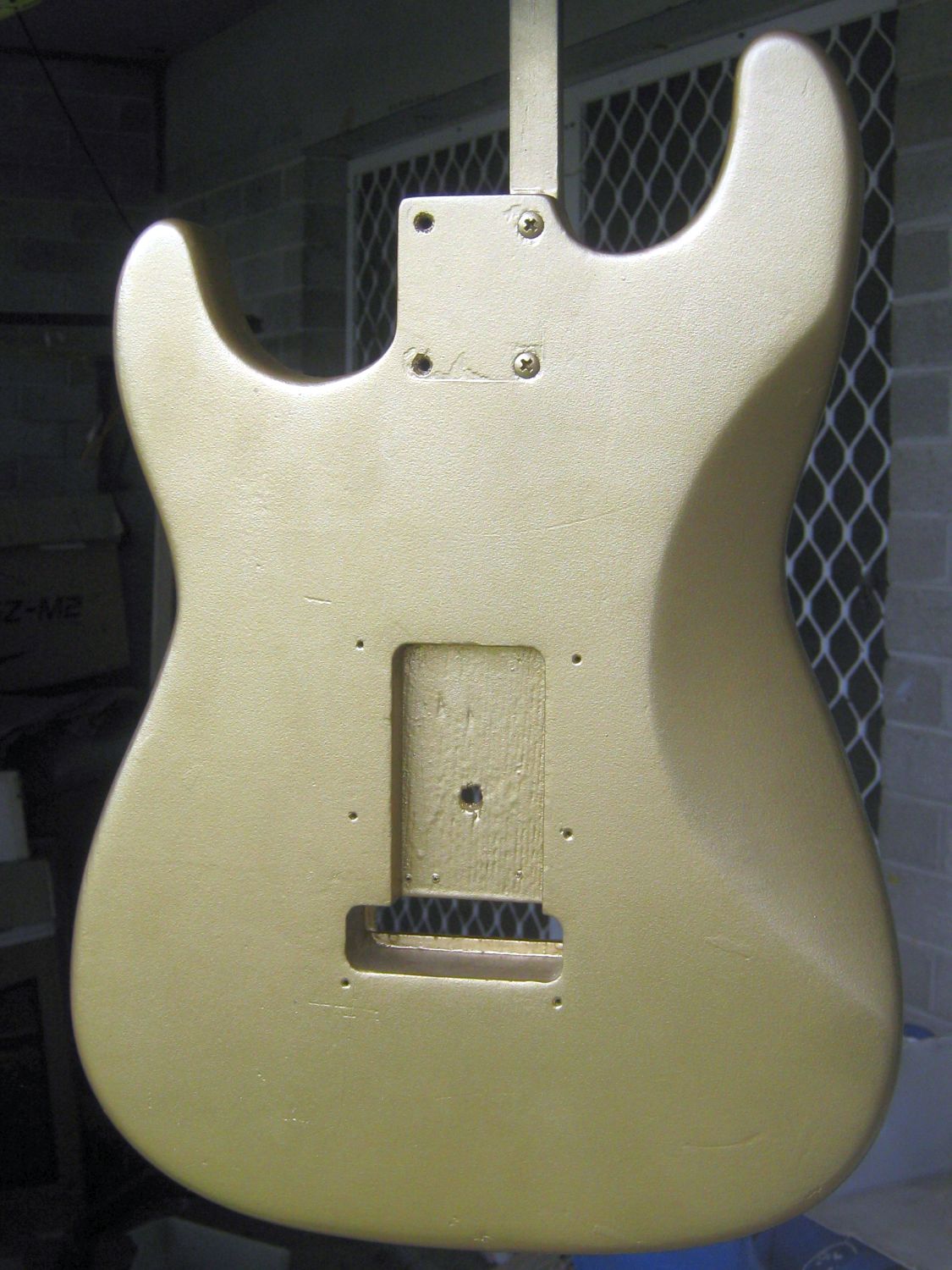 I just sprayed a third coat of clear coat on the Gold Strat body, and have left it outside on my balcony where I've hung it up to dry-out on my clothesline, things are starting to really move along with this build project, I might do another three coats before I call it finished and ready for final assembly/setup/tune-up/playing.