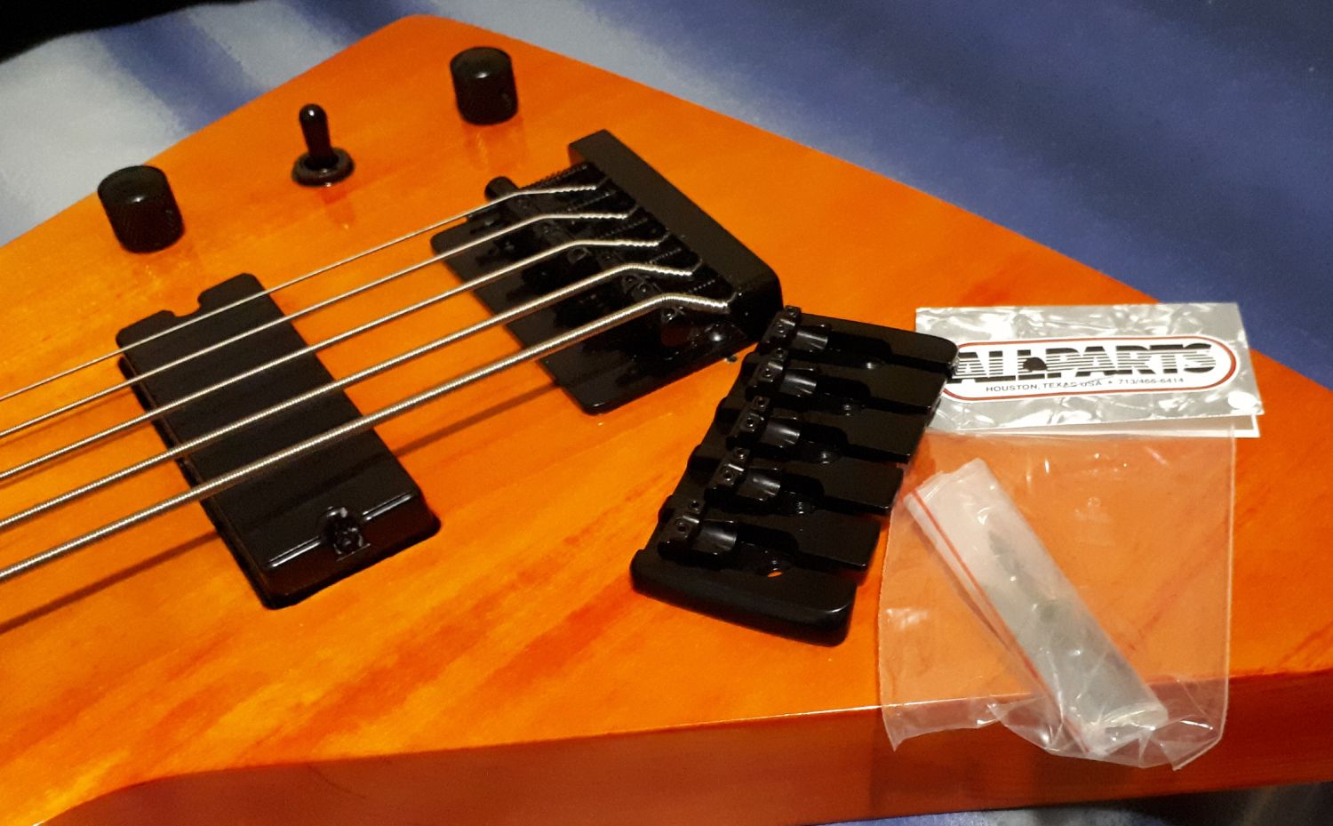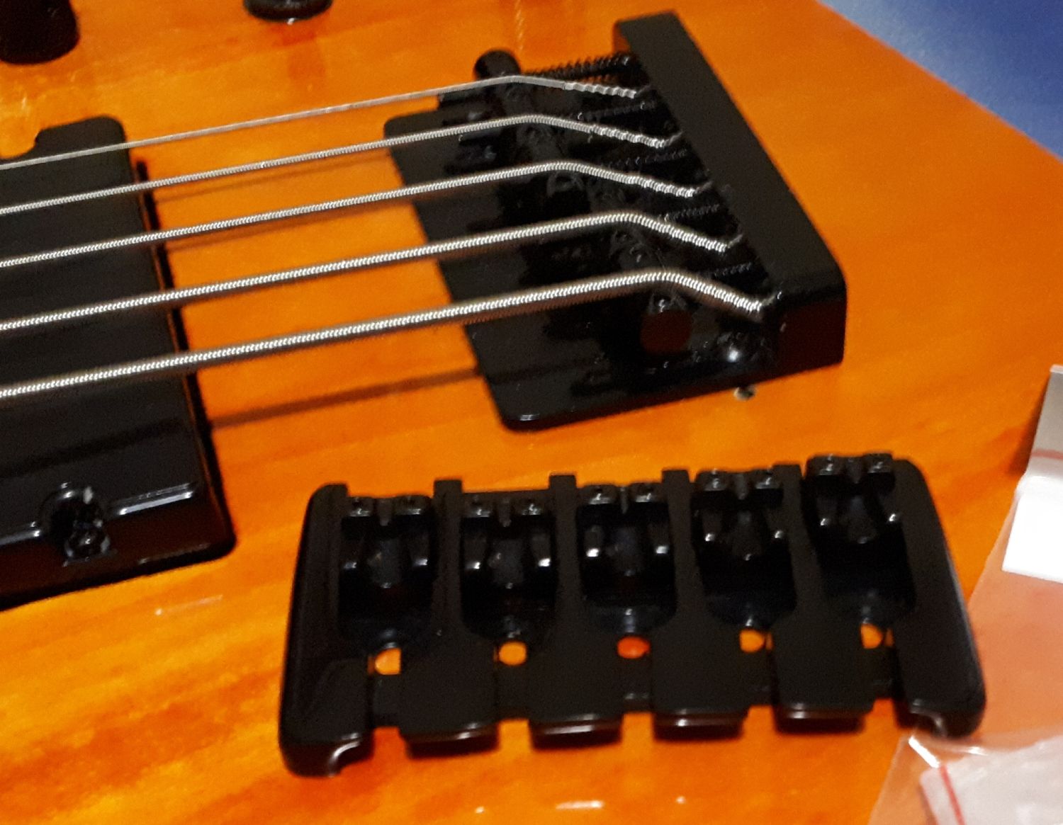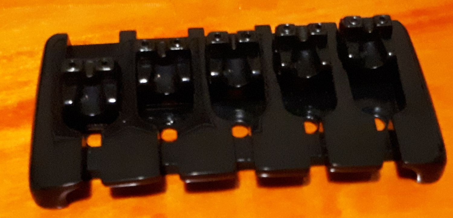 Spotted one of these on Real Parts website when shopping for other bits and pieces and thought why not? It can only help lower action at bridge end a bit more than at present but also help to reduce sharp break angle, particularly on the low B & E strings. It has plenty of small allen key adjustable movement and final intonation will no doubt take much longer than usual but it should be worth it in the end.
