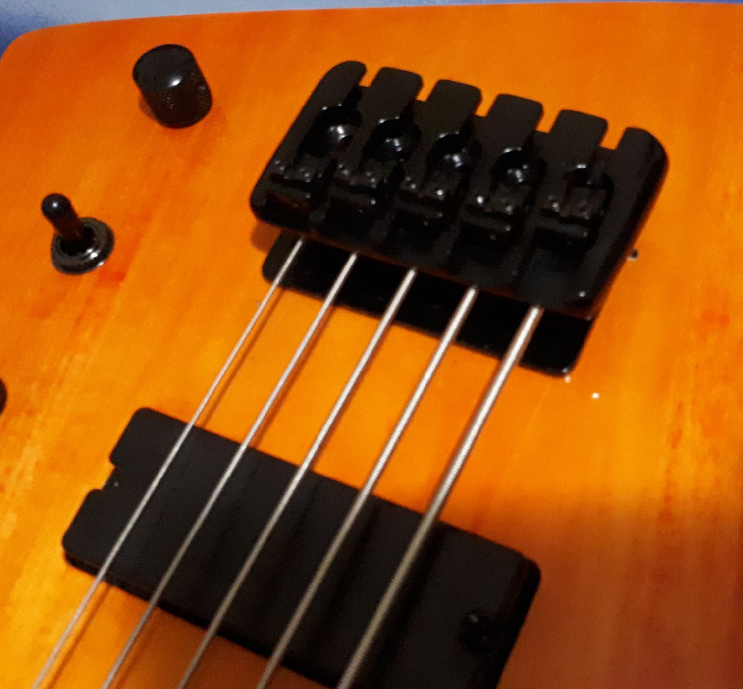 Have not been able to get the action nice and even all along the neck with this build and part of the problem seemed to rest with how high string saddles are on the bridge, even when fully lowered and also the ridiculous break angle from saddles to base where the strings are fed through. I reckon the cylindrical shaped saddles are about 10 mm or more in diameter which looks bigger than on a traditional F style Bass bridge?
