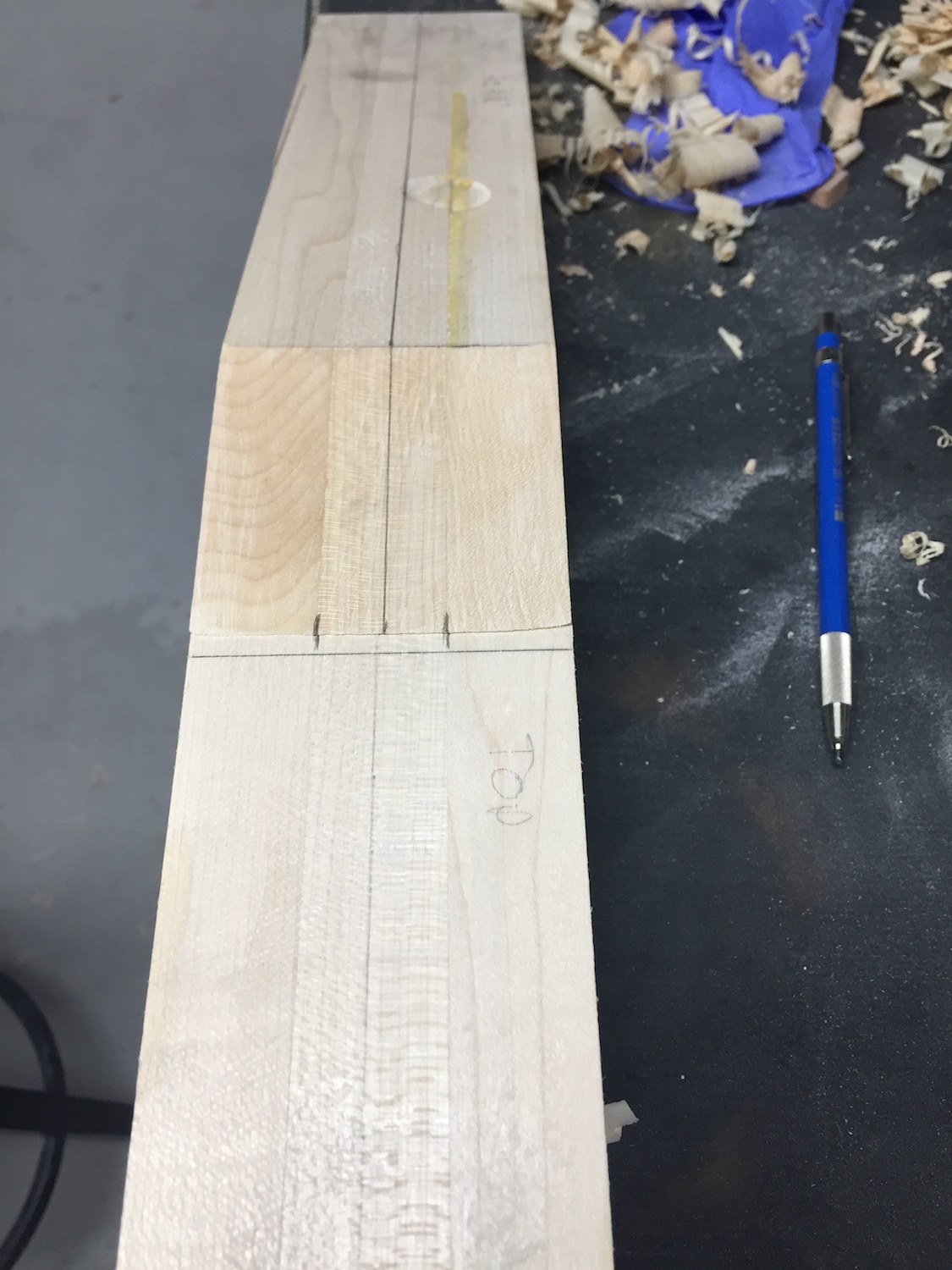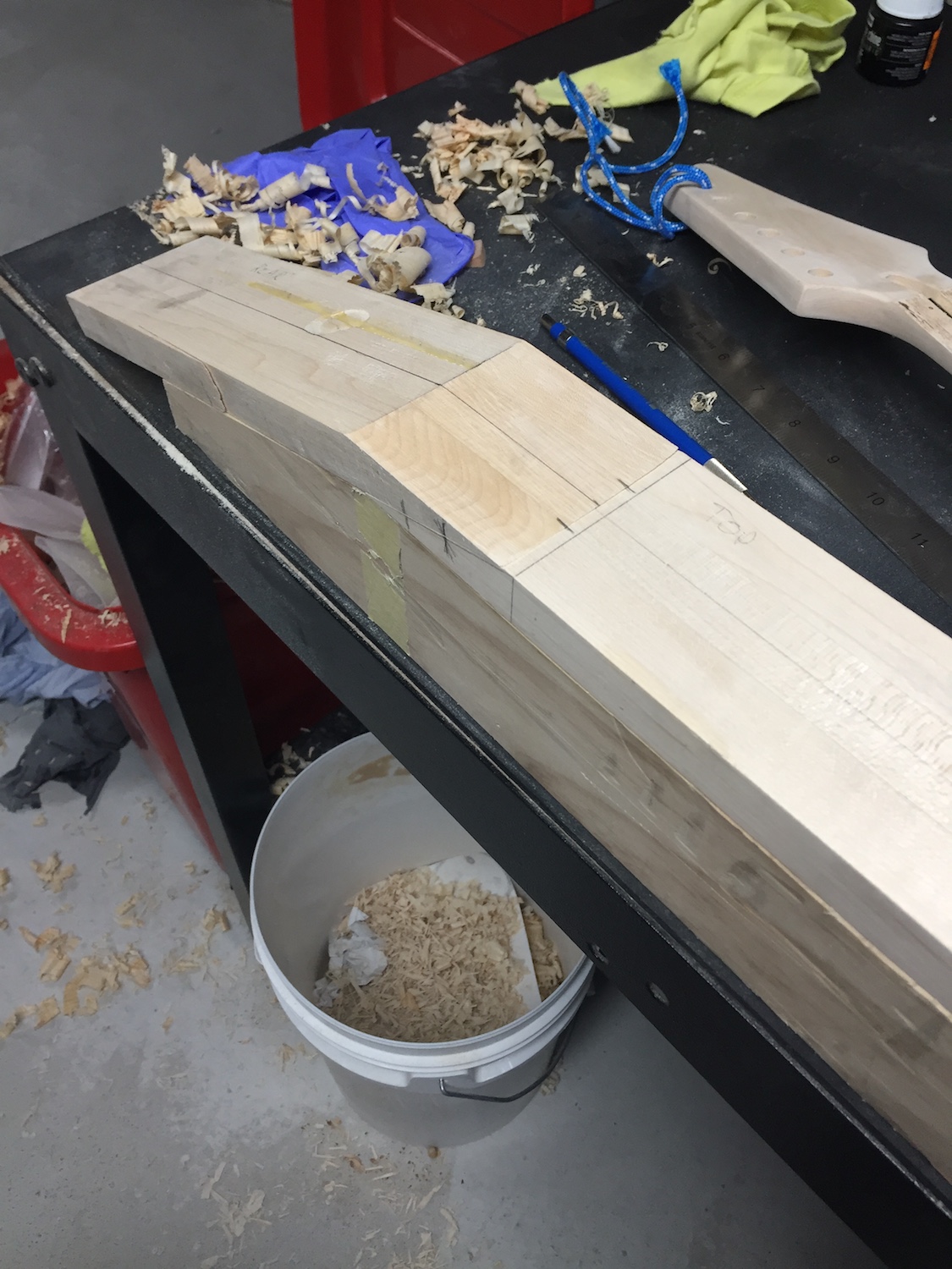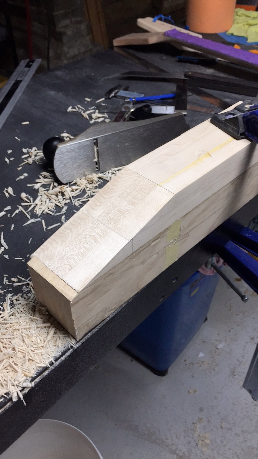 In prior instalments, we sliced up some maple strips, dressed them (Badly) and clamped them together with some titebond to get a rough and rude neck blank.