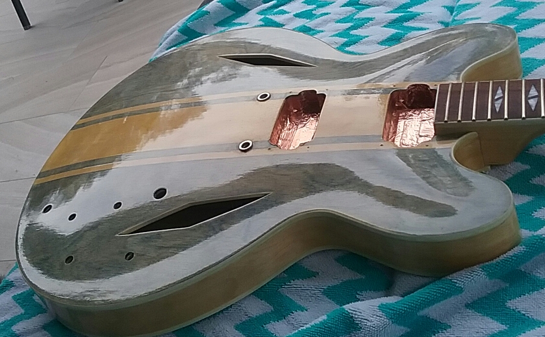 been over 6 months since this one was finished and the clear coats had never set it was still tacky and soft to the point were hairs from my fore arm where sticking to the guitar. So while i was finishing the grs i decided to sand it back and re clear coat, it diddent really sand of but rubbed of in little balls