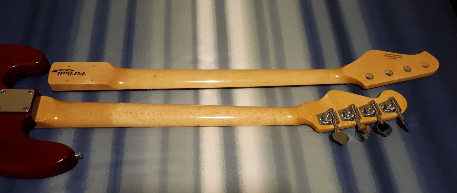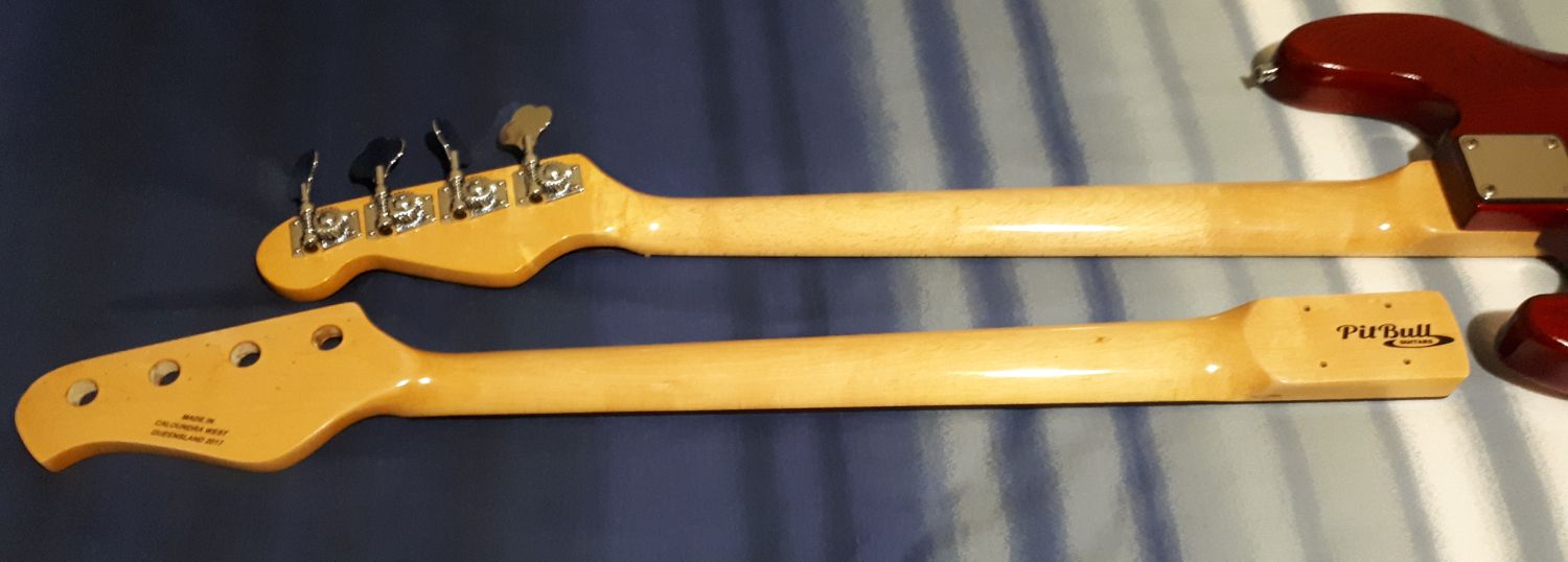 Almost done with final layers of finish and itching to get onto assembling stage. Thought the TO had an aged look to it and had to drag out the natural neck on my J Bass to compare and was surprised to discover both looked almost the same? From memory I thought the J Bass was lighter than that??? Here are the comparison shots....