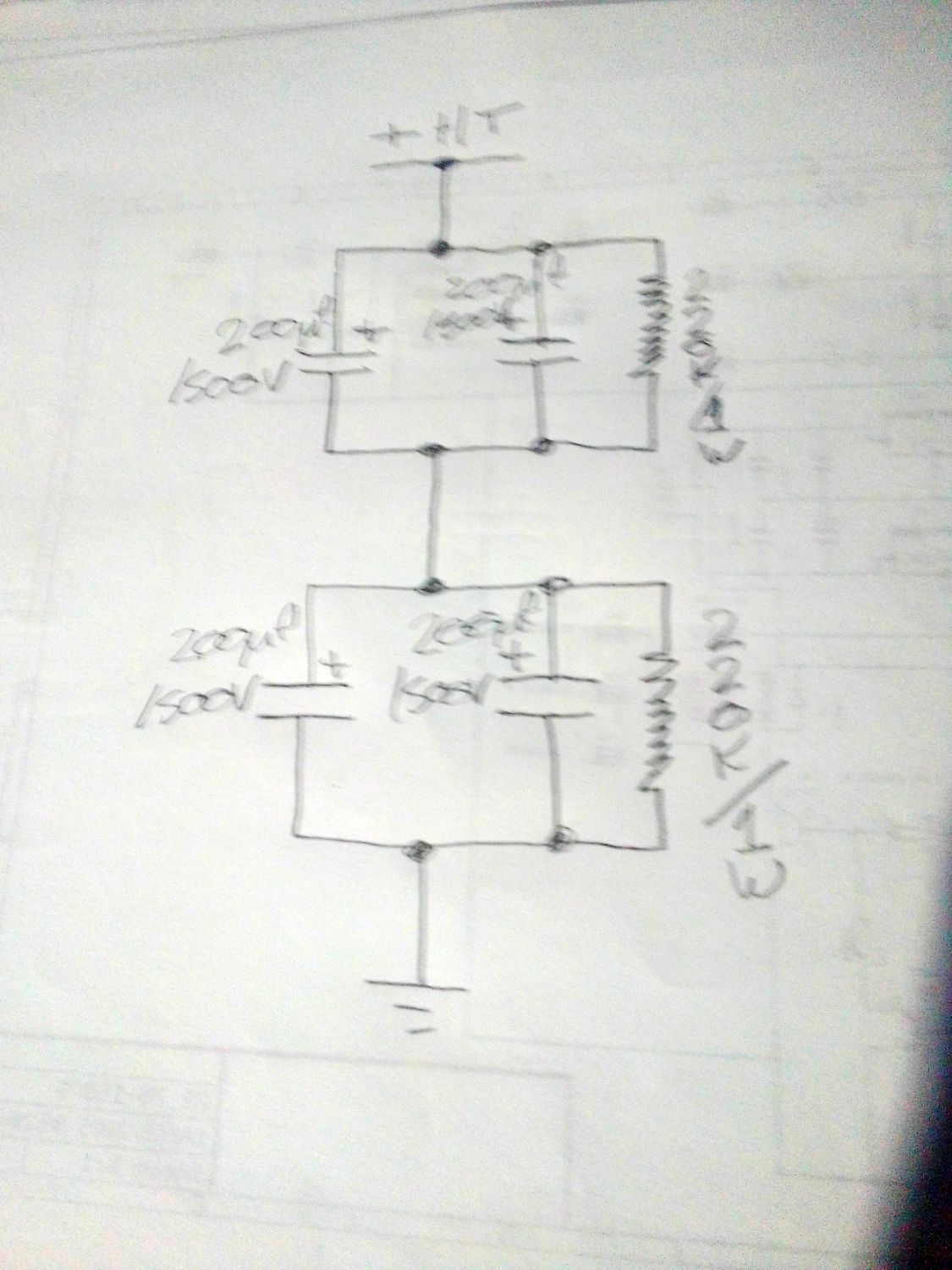 So, if you connect two 400uF/500V caps in series and connect the -terminal to circuit ground, and the remaining + terminal to the +HT supply like this with the two 220k/1W voltage equalizing resistors, each capacitor should have about half the +HT voltage on them: