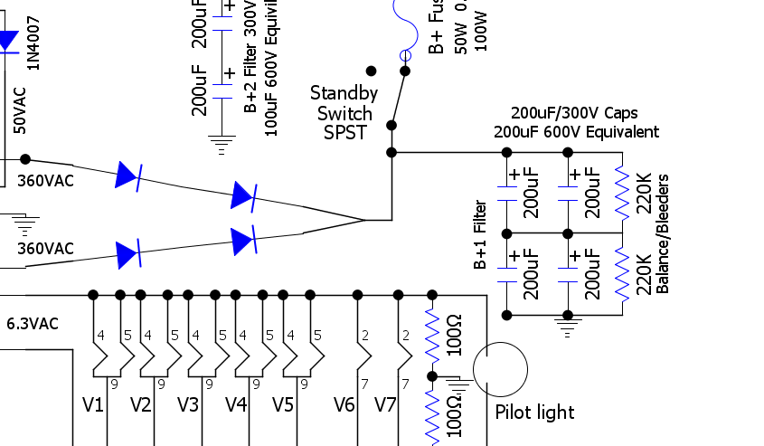 The thing I'm most concerned about is putting too much voltage on the single 47uF cap and the two 10uF caps in the power supply circuit in my build, I'm using a black F&T 47uF/500V Axial and two blue Sprague Atom 10uF/500V Axial caps in my build, if I go with the transformer with the 375-0-50-375 V AC @201mA secondary the main +HT voltage is definitely going to be higher than 498V DC, I'm estimating probably something like 560V DC, which could over-voltage some caps in the power supply.