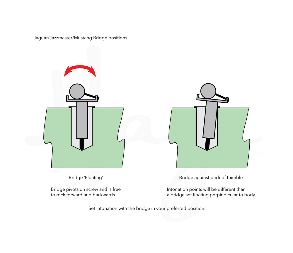 The jaguar has a floating bridge, the bridge has 2 pivots which you extend with an allen key. DUH... Now it floats and pivots nicely. If you want a non floating bridge just use a nylon or plastic sleeve made from tubing.