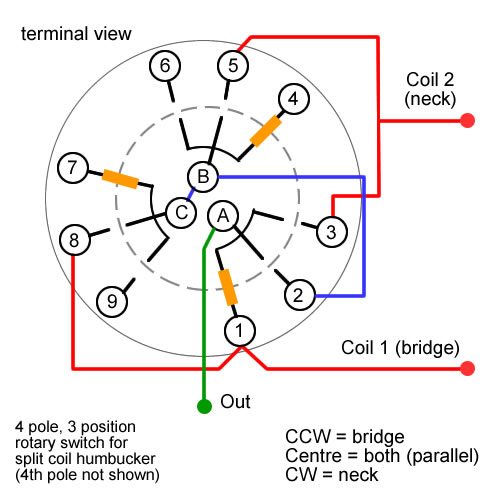 Unfortunately RalphH, that switch wiring won't work as-is with Waz's pickup as it's only 3-wire. The pickup coils are internally wired in series, with the 'third' wire connected to the centre connections between the two coils. So it can be tapped but cant be connected in parallel unless Waz takes the pickup apart and manages to wire it as a 4-wire pickup so there's fully independent access to both coils.