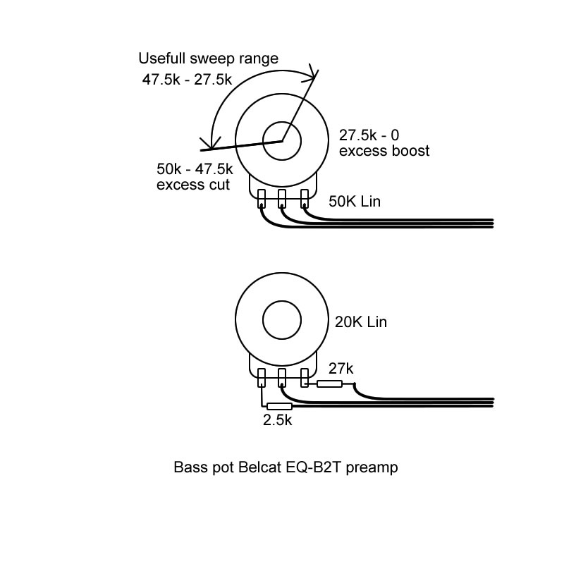 Another little trick with the Belcat EQ-B2T preamp is that the bass boost/cut can be excessive, with a limited useful range of the pot. I "corrected" this by changing a few components around to get the travel of the pot to provide the best tonal variation. Hope this helps.