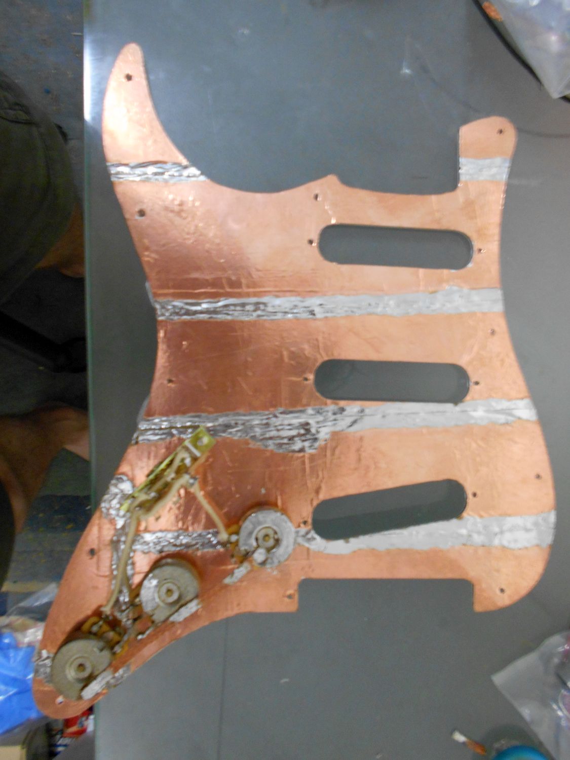 I decided to go all-out with the shielding on the scratchplate and covered it completely with the copper shielding-foil, now some builders may think that's a bit excessive, but personally I think you need a good solid ground-plane in a device, or instrument, that's generating a relatively low-voltage, low-current signal in order to reduce the susceptibility to hum and radio-frequency noise, the last thing you want to hear in a live, or recording situation is either a constant..mmmmmmmmmmmmmm.....in the background, or some radio station broadcast from a foreign country to disrupt your performance of that meticulously constructed epic solo, or song, which tends to happen when you least want it to, i.e. right at the start or right in the middle of it when you're all hyped up.