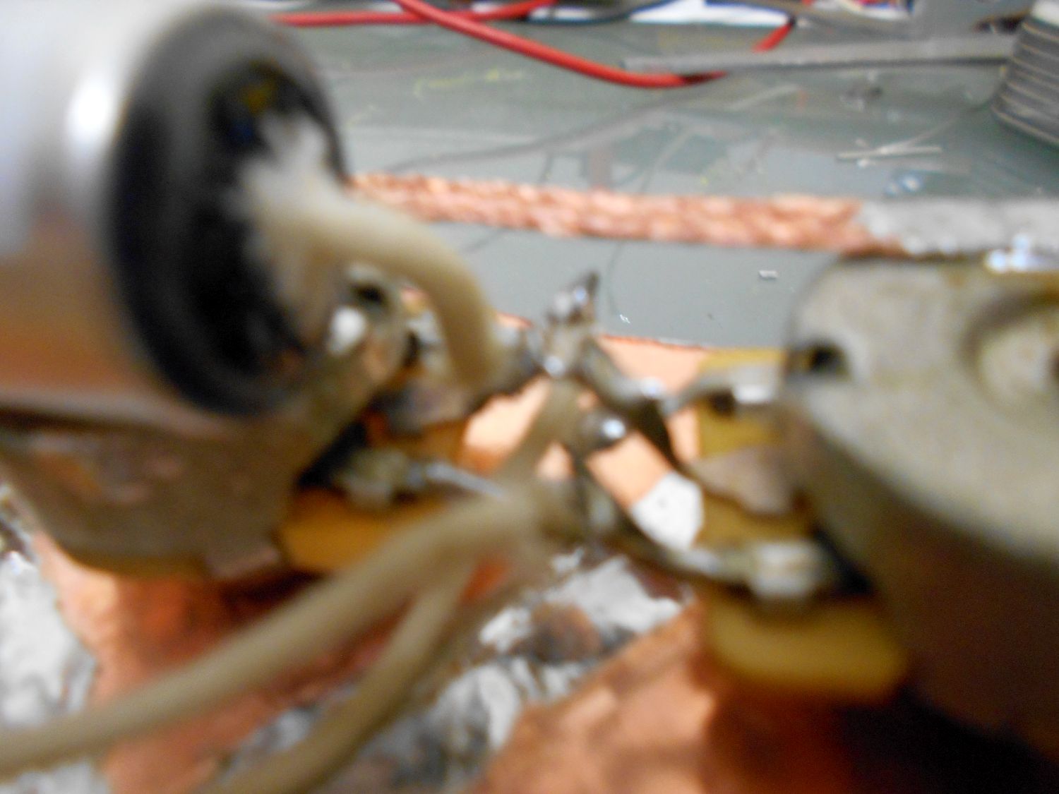 You can also see the Vitamin Q .1uF/630V DC Tone Cap installed on the scratchplate, I had practically no issues with overheating while soldering the cap in place, you may also notice that I put a piece of cloth-wire insulation on both solder-tags of the cap, that's partly to prevent unintended short-circuits, and partly for aesthetics, hopefully everything is working correctly.
