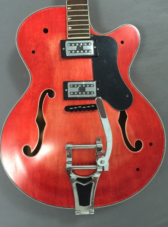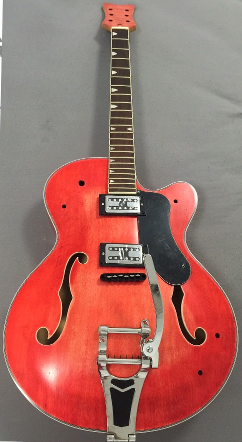 Hi Shazz, mock build looks excellent. I think you have the neck pup surround in the bridge cavity, try swapping them and the bridge height should look about the right height. I think once strings are on the wammy bar should come down but of the 50 odd kits I've built I've never had a Bigsby on one. The other GR builders can probably help you with the pickguard or if you buy the material have a crack at cutting your own