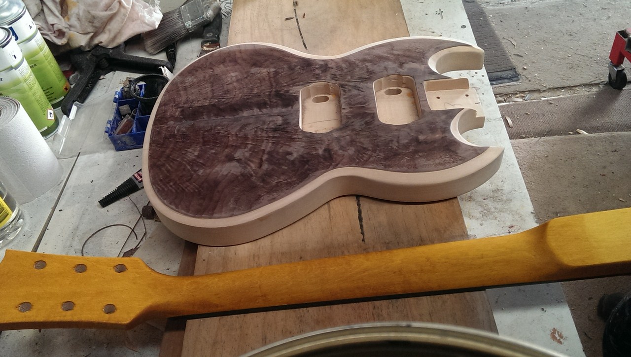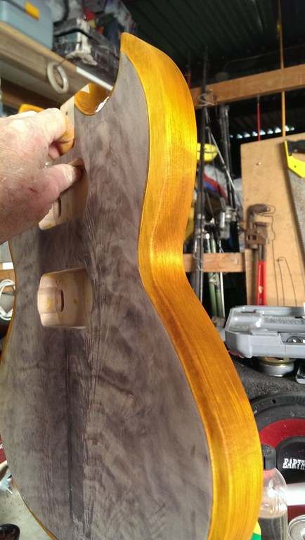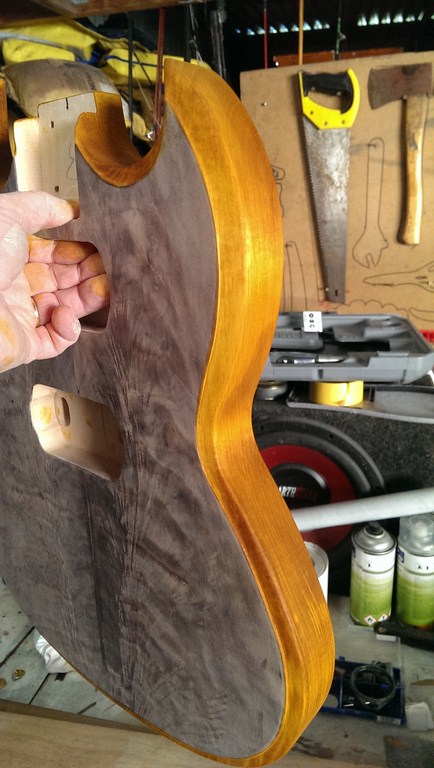 Wiped the top with metho to get an idea of what the finished colour will be like, then put it up against the neck colour.