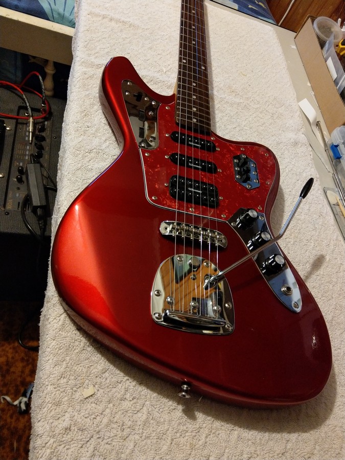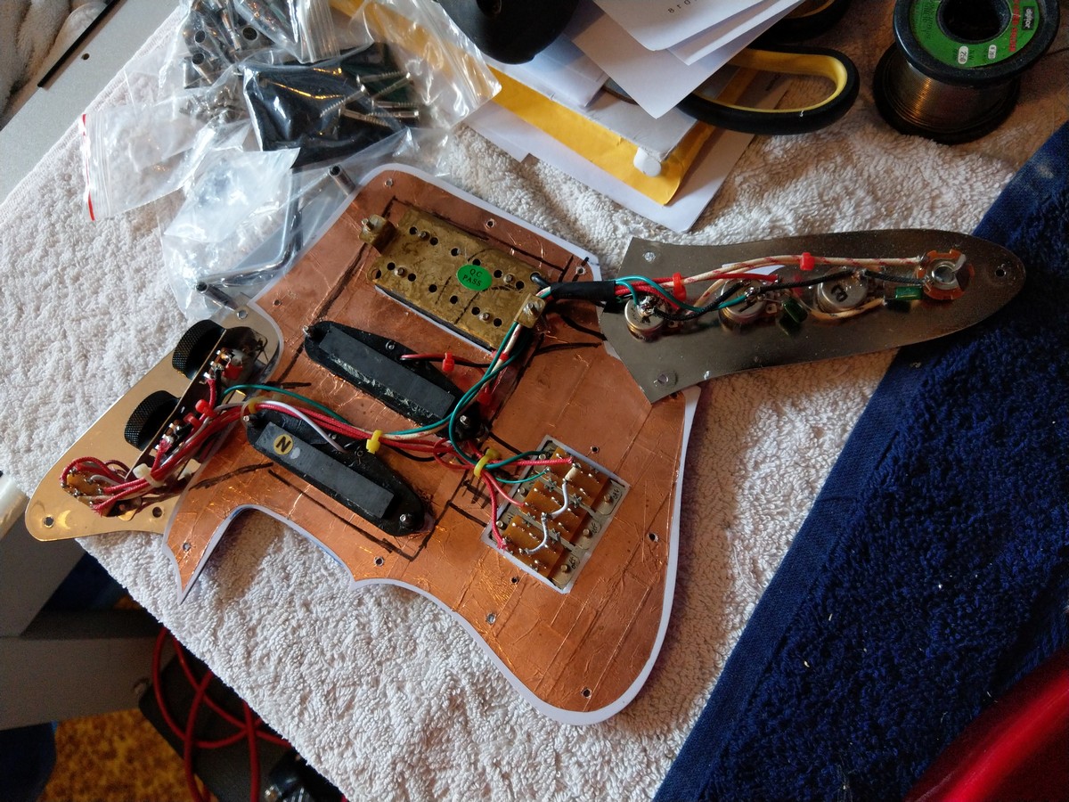 You don't need to run ground wires to the cavities if you run tape over the top of the body so it makes contact with the taped underside of the pickguard, preferably running up to some of the screw holes so the contact area is under pressure. It's not quite so pretty with the pickguard off, but you can't see it when it's assembled and it makes taking it apart again a lot easier.