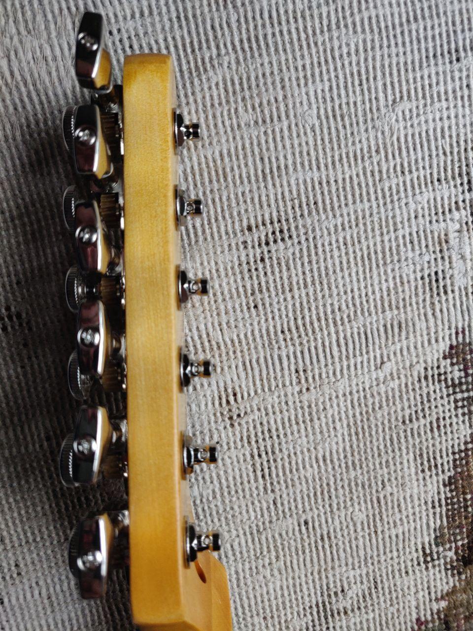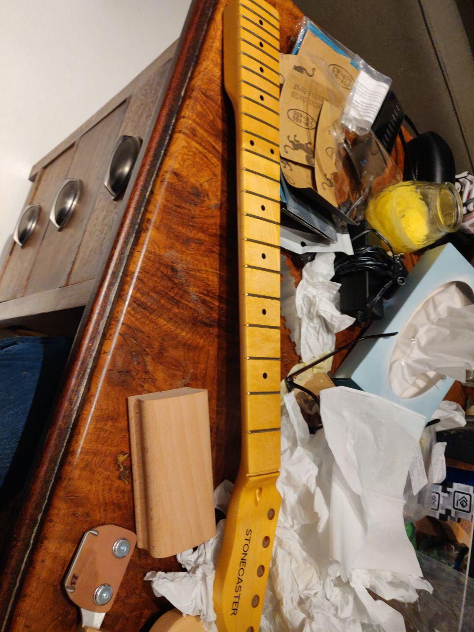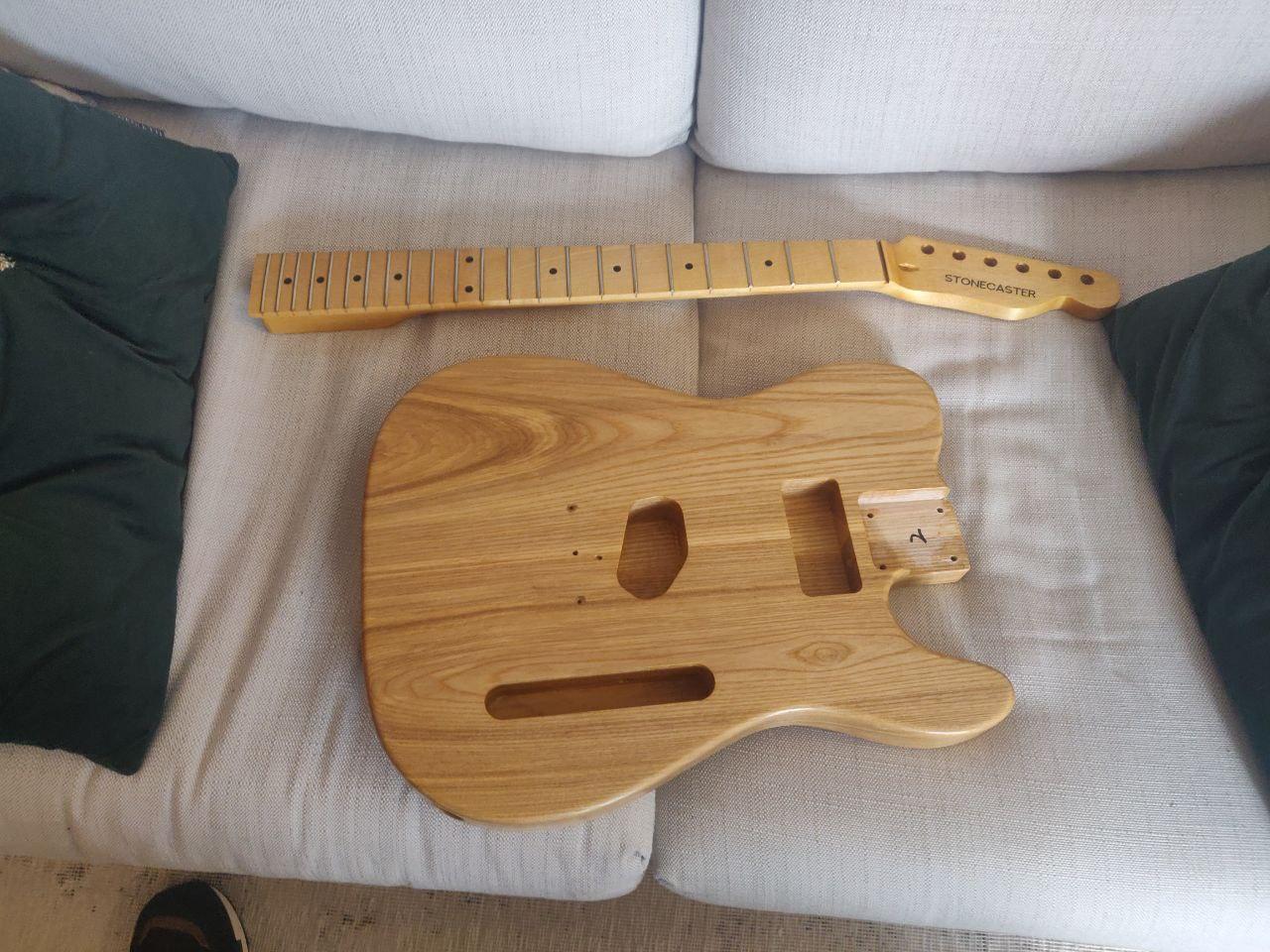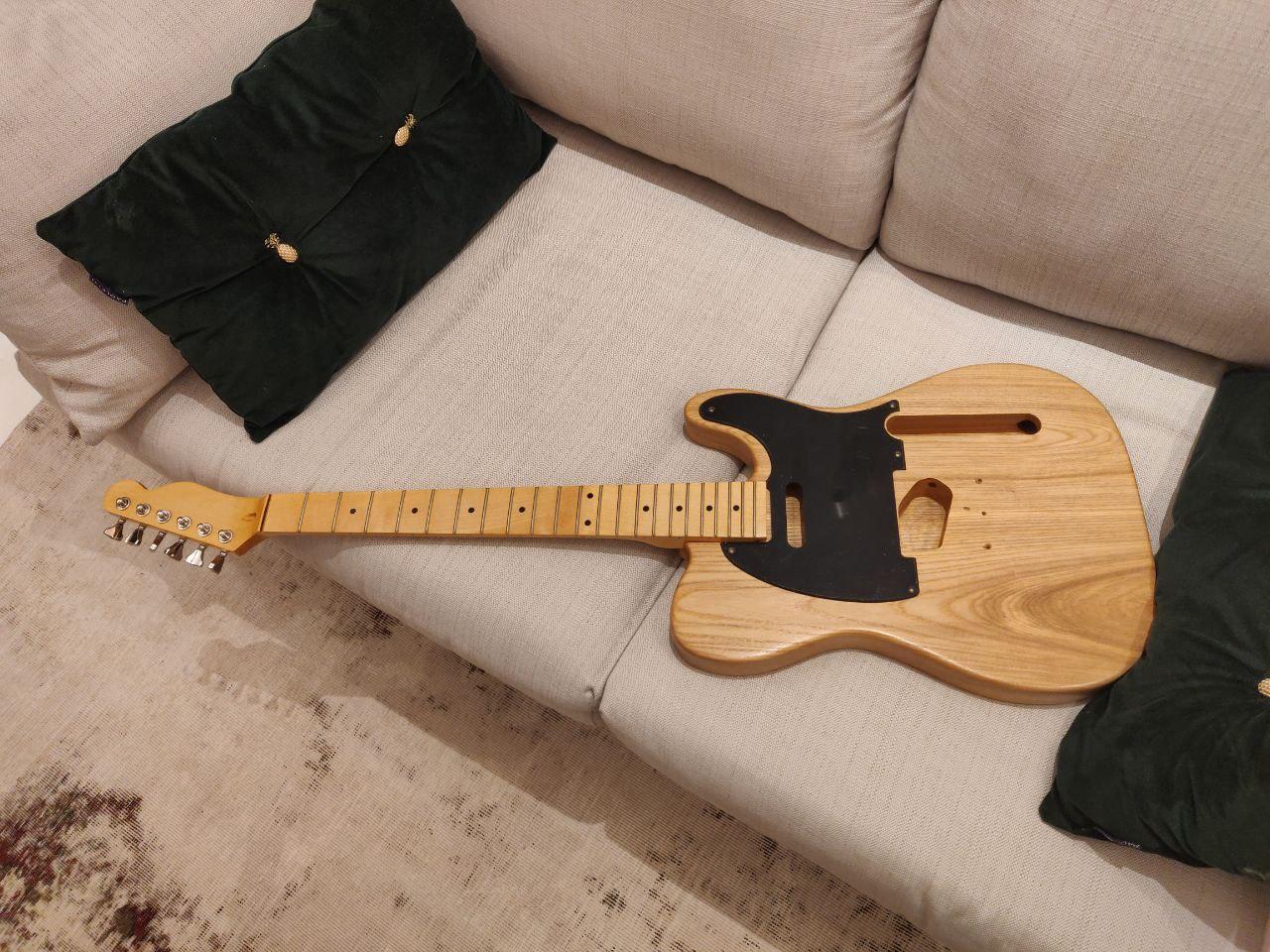 As the neck and the body are currently dry, I thought I'd try a test dry-fit with the tuners installed. I was thinking that with the nice grain on the body it might actually look good without a pickguard, but because the neck pickup position was factory-routed to humbucker size that probably wouldn't look nice. OTOH I'm not entirely sure of a light-coloured instrument with a white pickguard, so I picked up a decent five-screw black one on Amazon and I think it will look pretty good, once I've filed a bit of material away around the heel of the neck, where it doesn't fit right now. Here's a photo with it roughly in position: