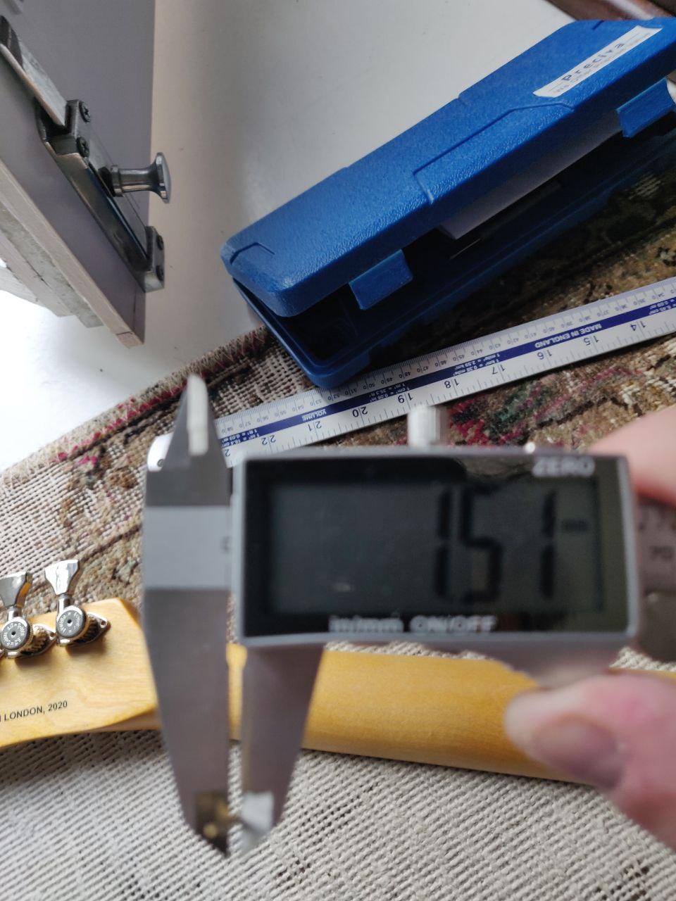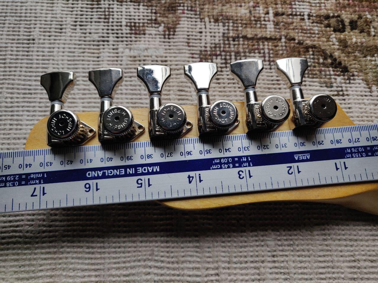 Anyway, onwards! Time to fit the tuners. I attached them reasonably tightly -- enough that they could still pivot with a little effort -- and then used a straight-edge to get them, um, straight: