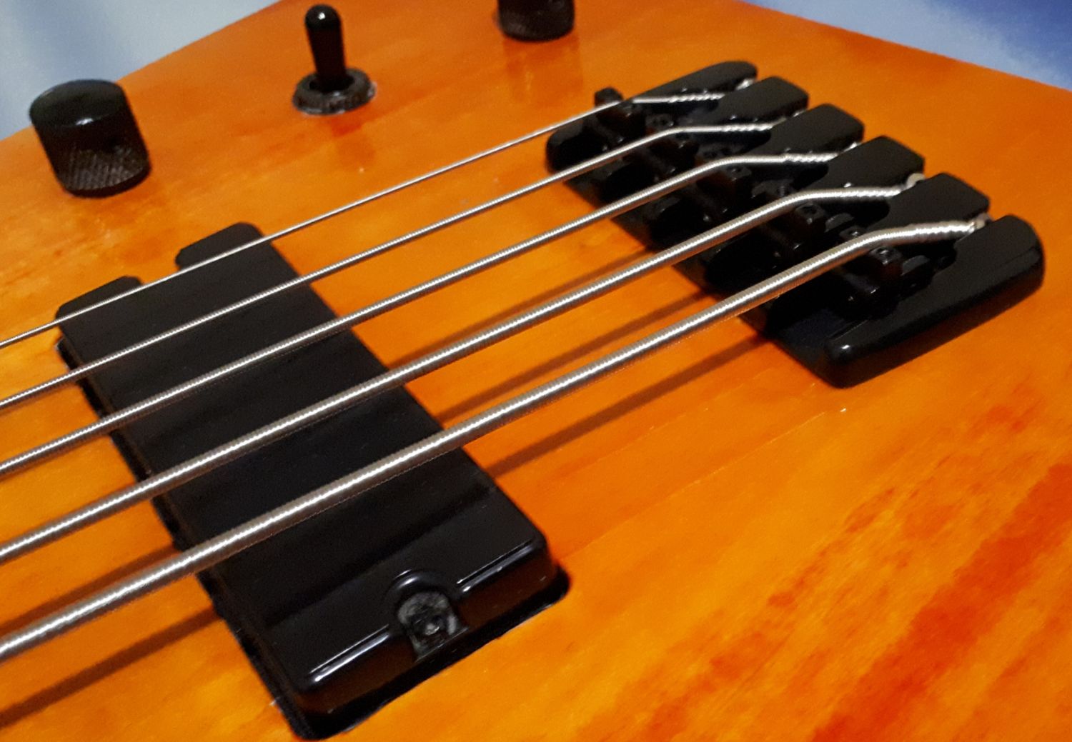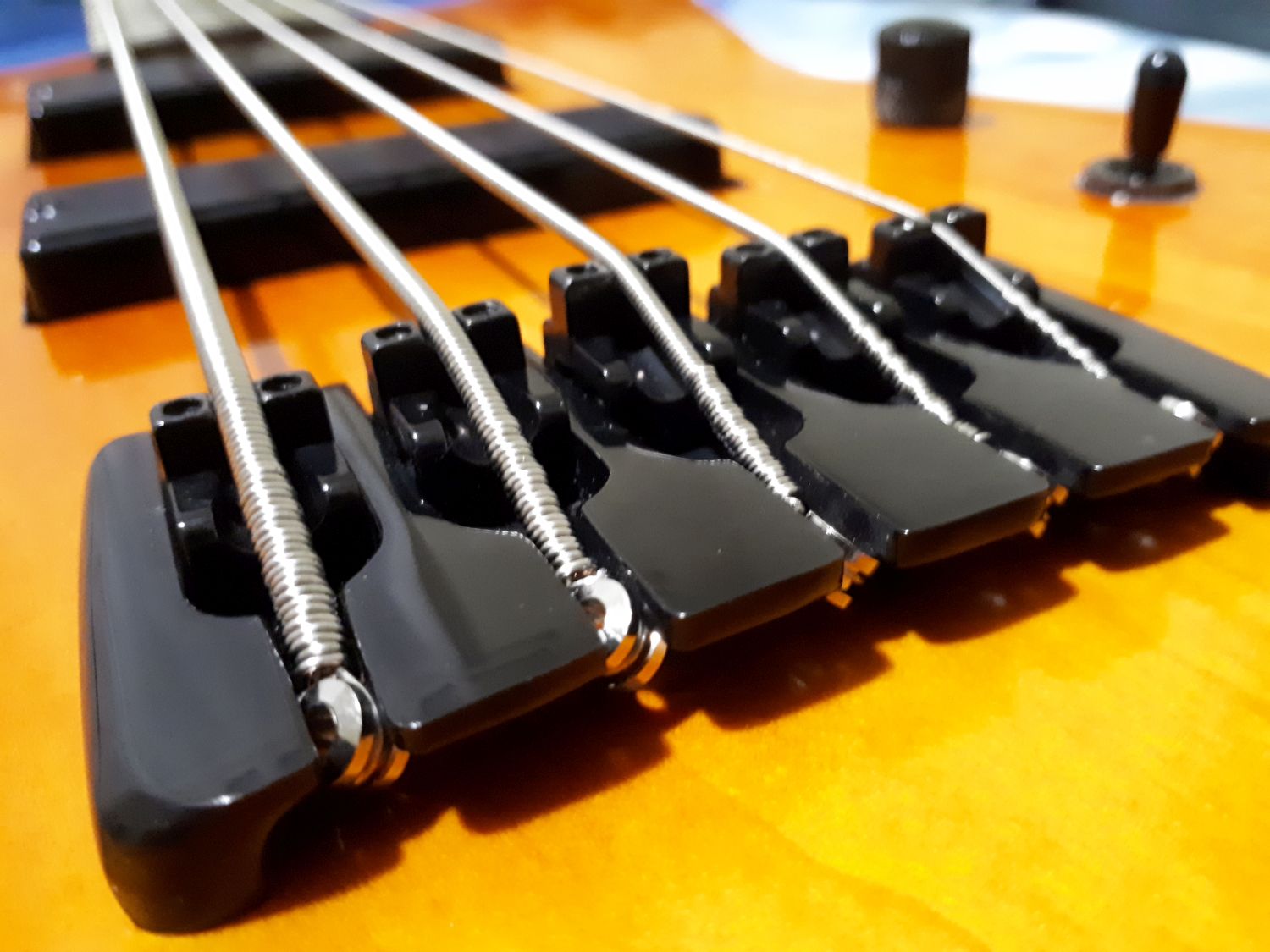 This fiver has a huge amount of tension on the neck and even with truss rod fully wound up tight there is still a very slight forward bow up near the nut end. Main reason for swapping bridges was to achieve a lower action however this thing was buzzing all over the place on most strings and ended up with an action that is still a bit on the high side, maybe not quite as high as before, possibly 1 mm lower??? Not sure but this bridge is a better design with how strings are loaded and if you like to palm mute, as the old guitarist in me does, this bridge is much better for that too.