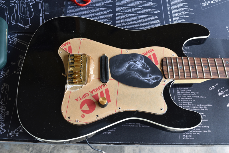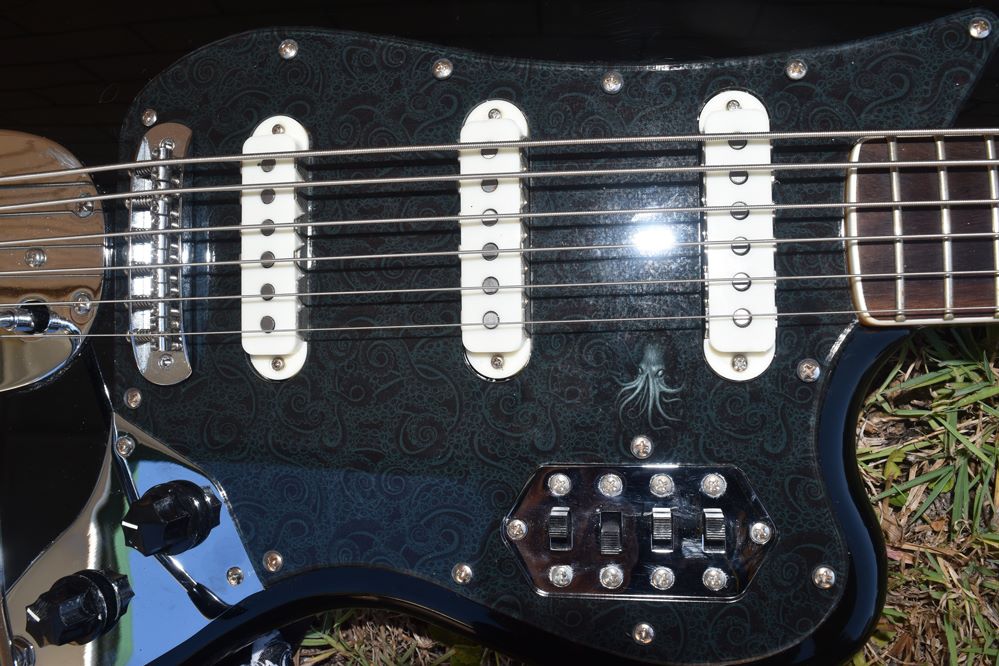 Anyway, trem cavity is filled on the top, back has a new custom cover, new hardtail bridge, pick up is a Kent Armstrong. Single volume control/push pull to split the pick up.