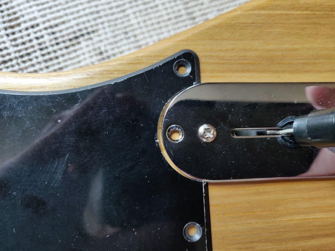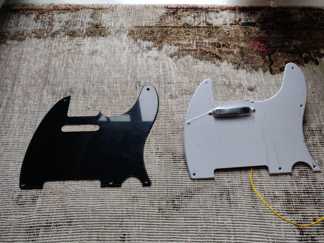 Next: I'd decided to swap out the stock white 8-hole pickguard with a black 5-hole one: