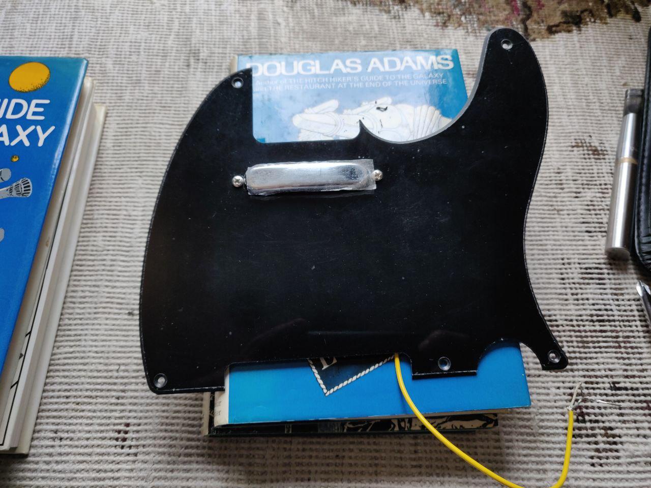 For convenience, I still want to have the pickup mounted to the pickguard as per Simon's earlier suggestion, so removed it from the white one and put it in place: