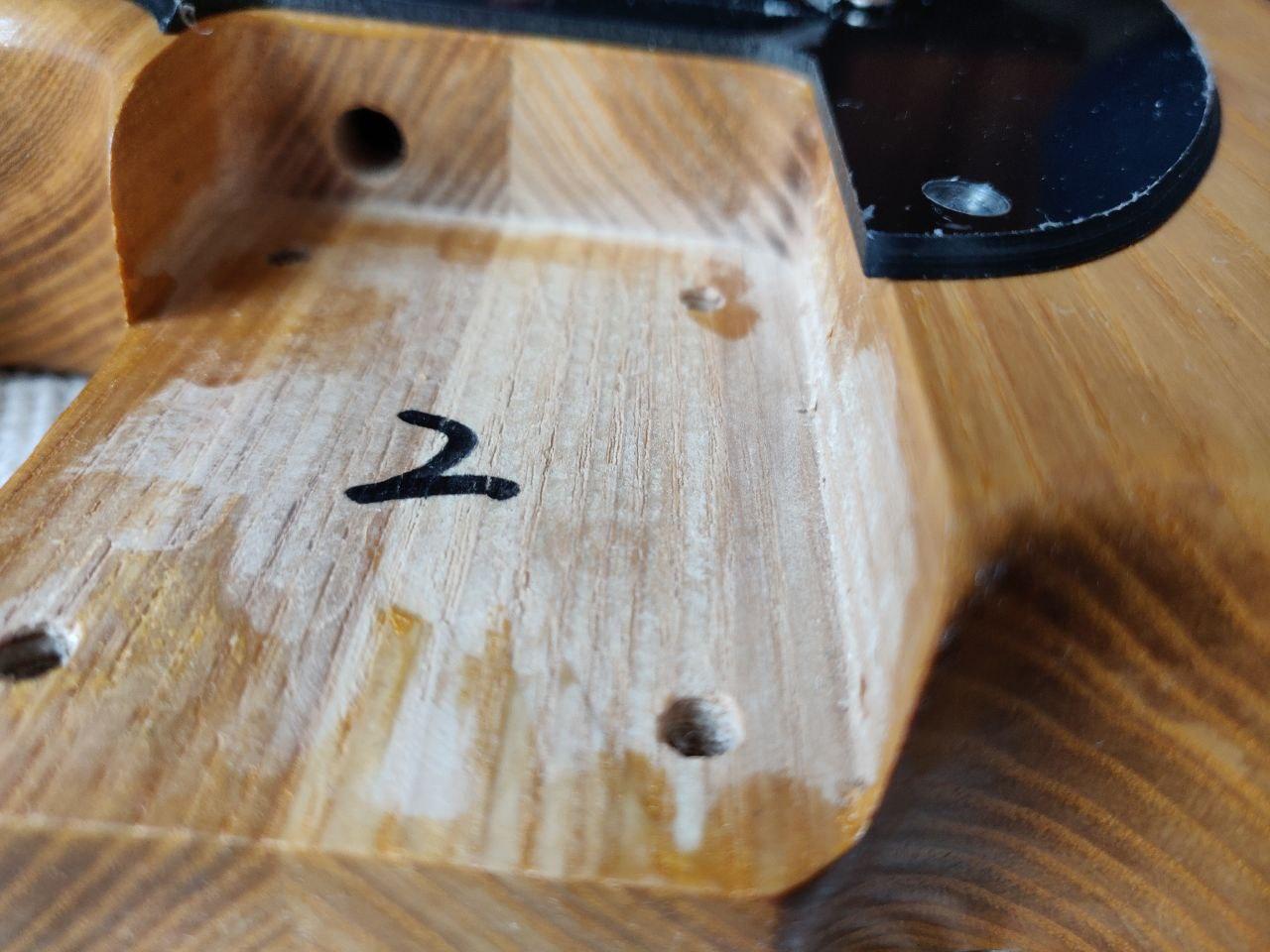 Used the pin vice to drill again, working my way up from 0.5mm to 2mm bits; first pilot hole from the back so that I could drill it through the pickup's mounting hole, then the others from the front so that I didn't get ugly visible tearout. First hole done and screw in place to test: