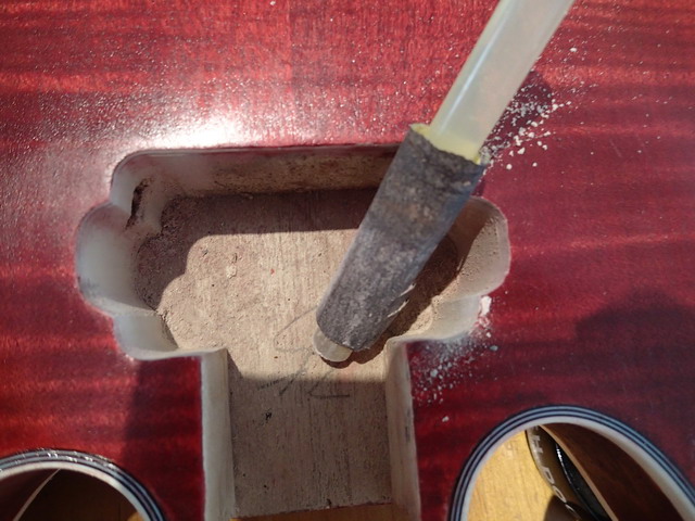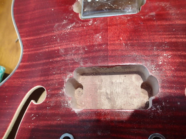 I needed to expand the pickup routes to take the Duncan Designs, and seeing as the guitar has finish on it i took the steady as she goes approach.