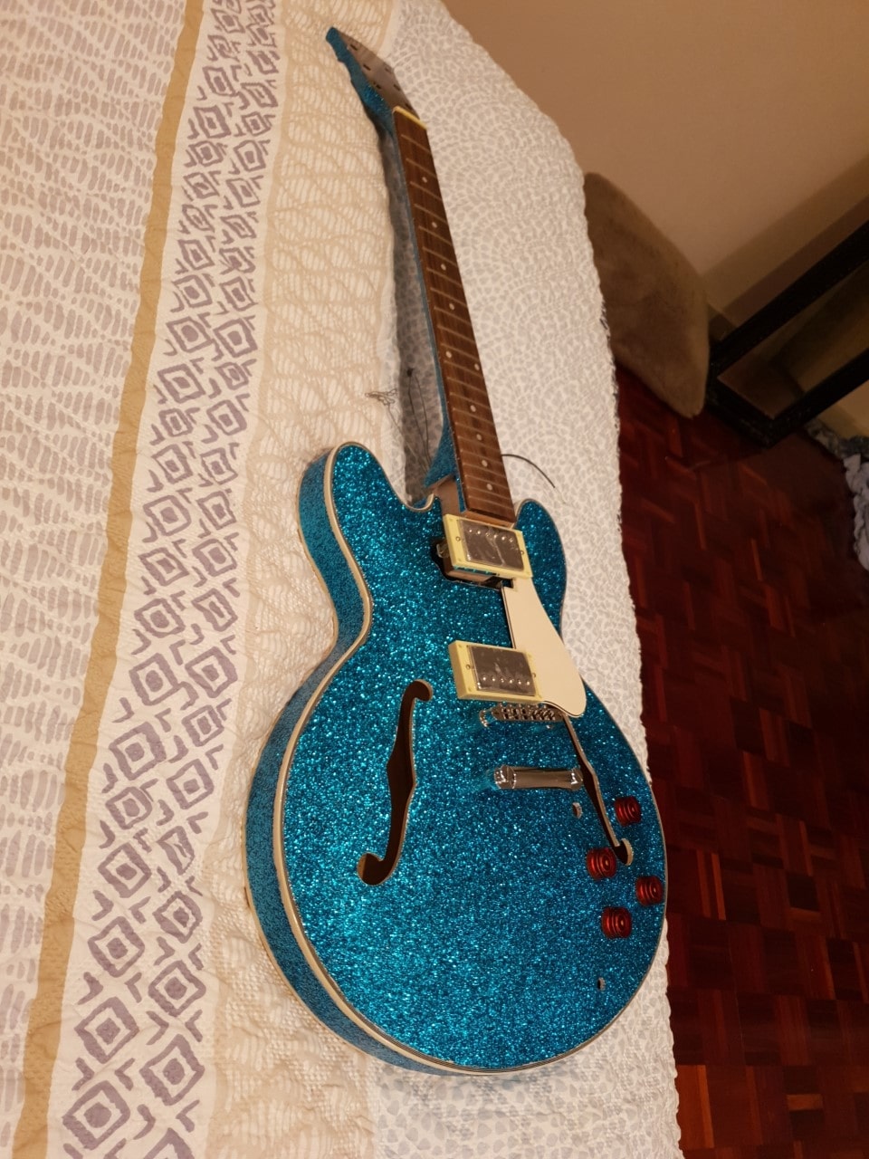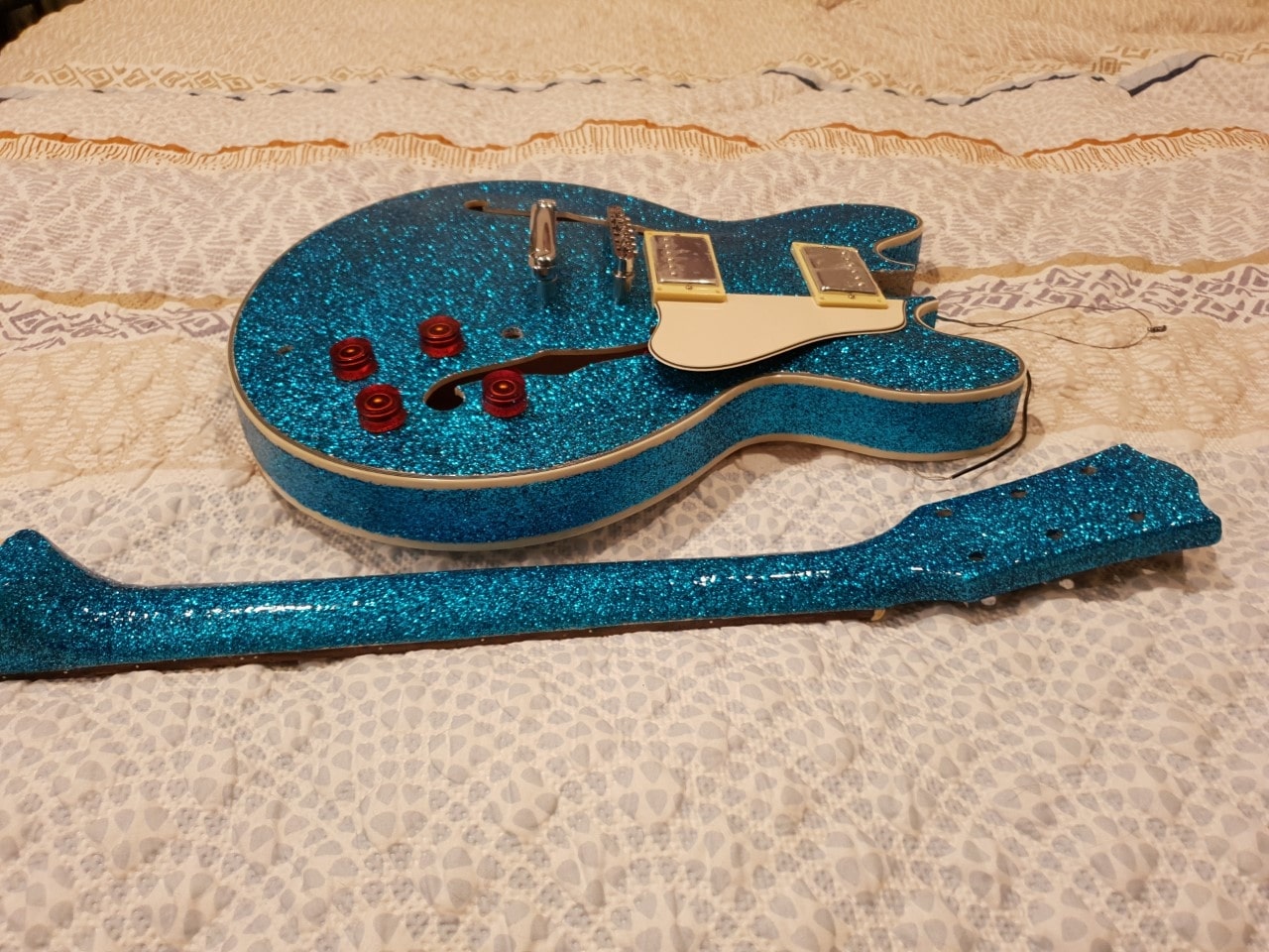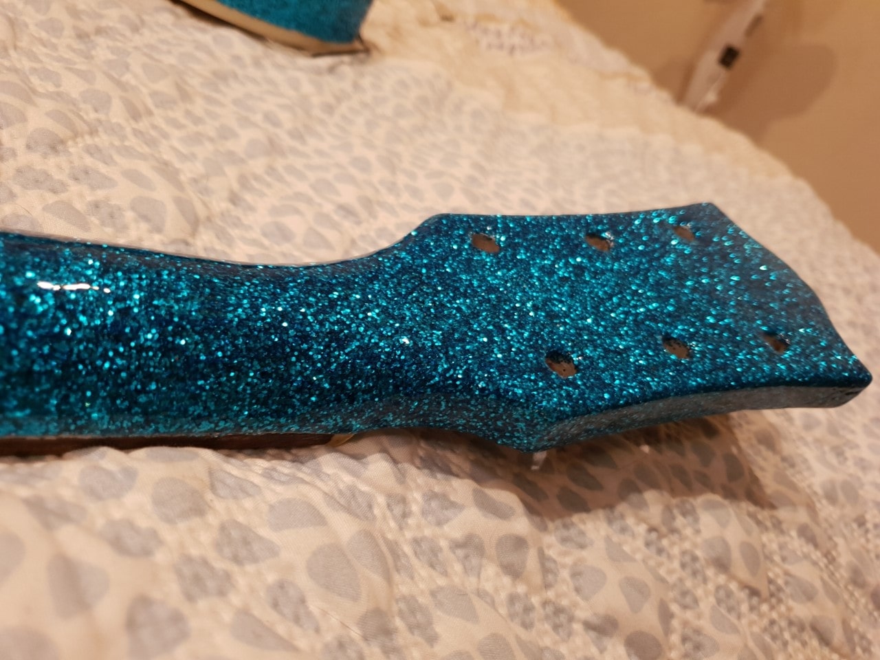 Yeah I just laid down a coat of clear and once it was a bit tacky I sprinkled the flake on. Then just went over it with more clear.....a lot more clear. In hindsight I'd use .015 or.008 sized flake as this was .025 which looks great but you have to use an extremely thick coat of clear to get it even. I'm still going to need to do a few more coats of clear to get the neck level and it's already had an entire can dumped on it.