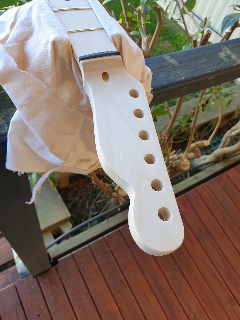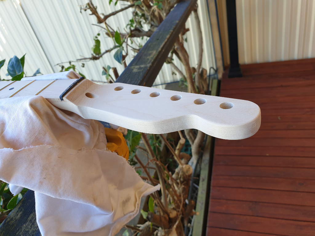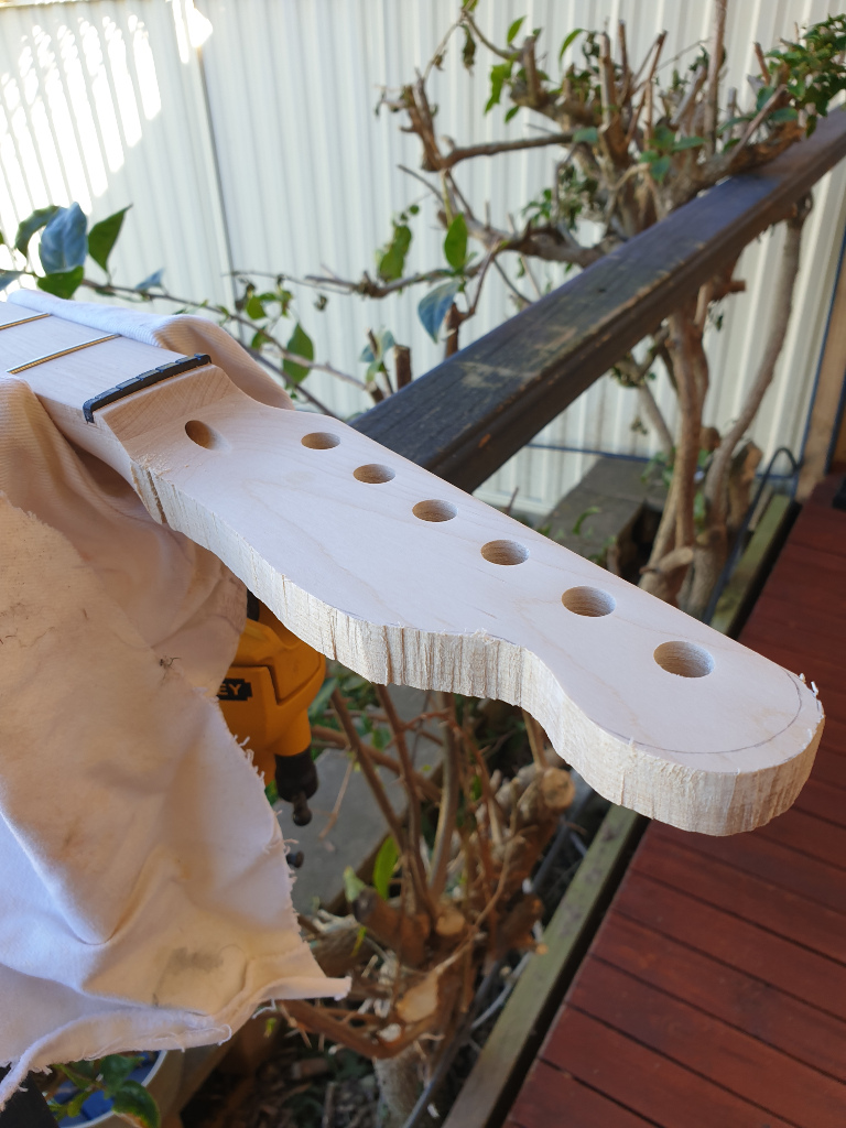 But, I hit it with a file, then some 120 followed by some 220. Still got some fine sanding to do but I'm not totally unhappy with it. Had to sand a little bit further than I'd liked near the neck due to my blade cutting a bit too deep in the wrong direction, but it shouldn't be too bad.