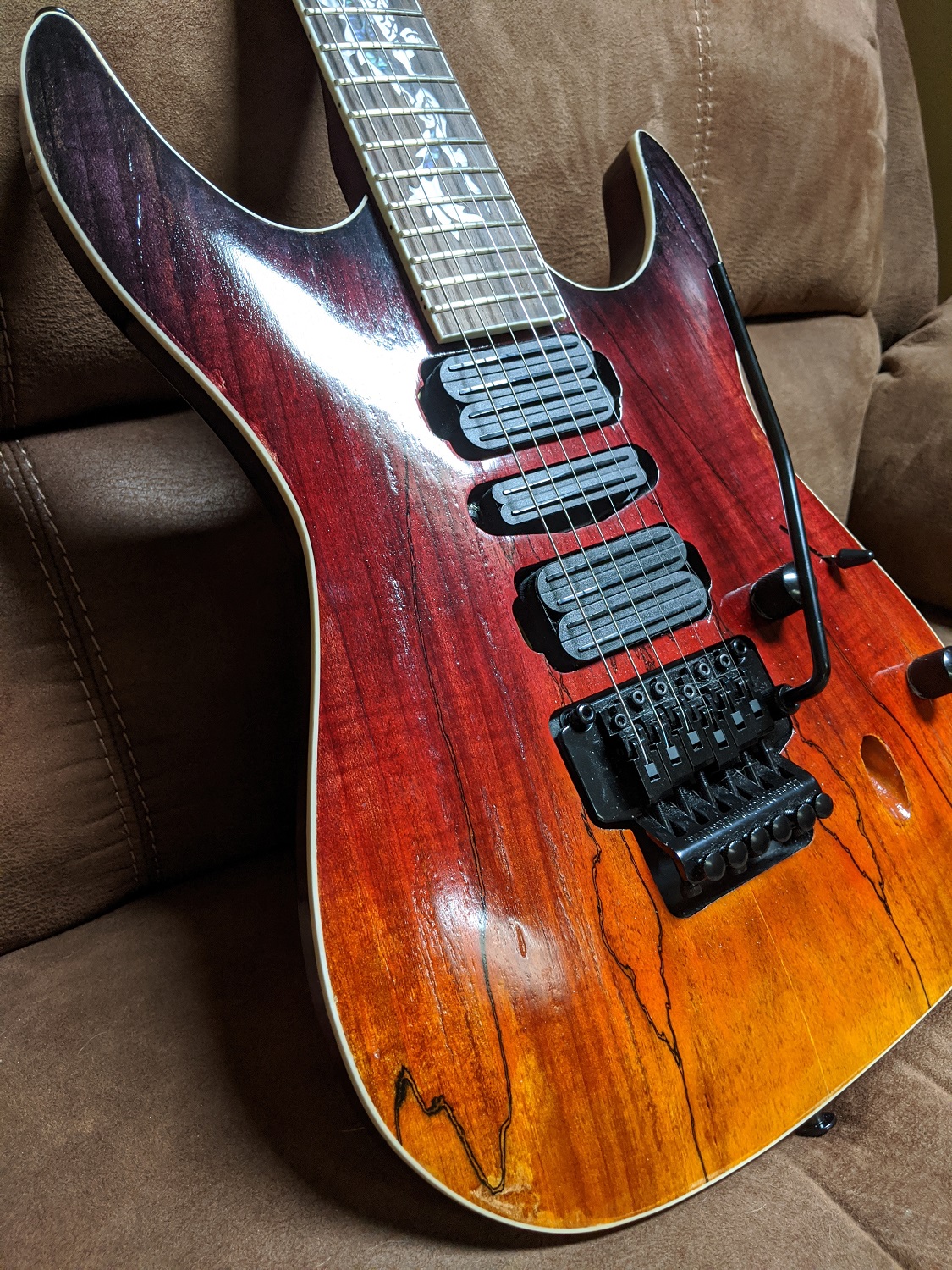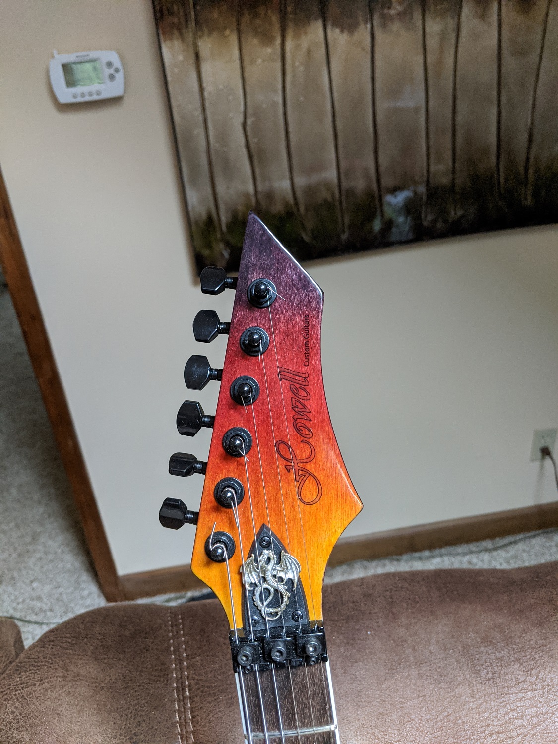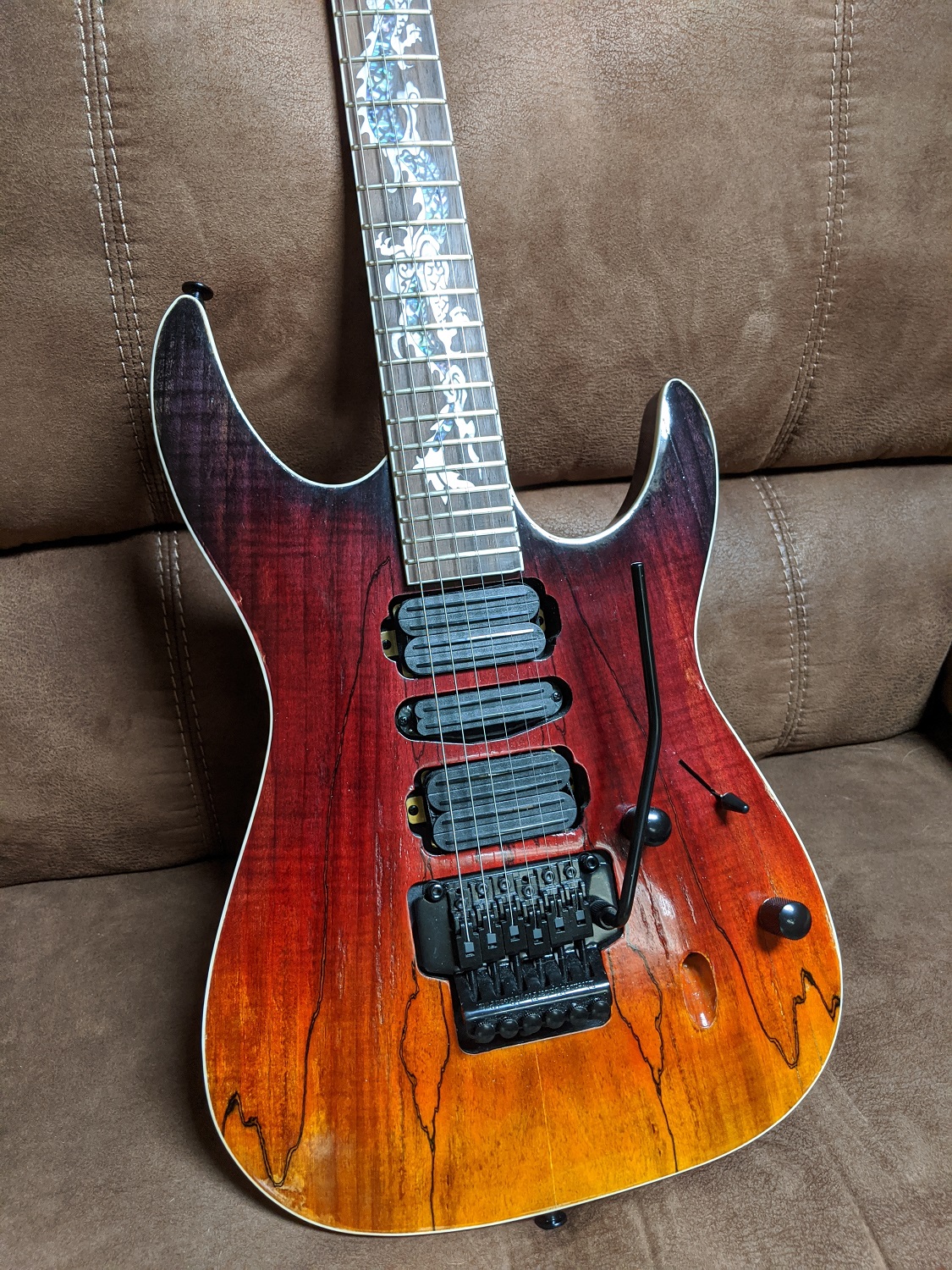 Hey Guys. So this is my first build and it took me a long time because I was so busy and just chipped away at it a little at a time, but finally it's playable and I must say I'm really happy with how it plays - probably the best action of the dozen guitars that I have. I went through many practice blanks to get the color blending the way I wanted it. Because the spalted maple had such a nice pattern, I wanted to make it look like the dragon inlay was flying out of the flames of the body. So I was looking to create the coloring of flames in the body. If I were to do it all over again I would realize the poly darkens up the color a little and I would have left it a little brighter. I thought it was a little bright at one point and I blended in a little brown to tone it down a little and that was probably not necessary but that's what we learn right? Anyway, other mods were as follows: the truss rod cover I found online, The pickups are Dragonfire quad rails and duo rail because that seemed appropriate, and the electronics are kinda special. Both pots are push-pull. Volume down is humbucker, up splits both the bridge and neck into single coil. With the tone pot down, the configuration is like a Les Paul with only the bridge and neck selectable - the 3 middle positions of the 5way switch have both the bridge and neck selected. With the tone pot up, it's like a Strat configuration - regular 5way switch selections. My middle pickup is a humbucker and not splitable unless I add another switch so I left it. So with both pots up it is a SHS configuration and with the volume down and tone up, it is HHH. The body is hand-rubbed poly but I didn't put too many layers on the top as I wanted to keep the depth of the grain for effect. The back of the neck is TruOil and I'm really happy with how it feels. Hope you guys enjoy it.Attachment 34610Attachment 34611Attachment 34612Attachment 34613Attachment 34614