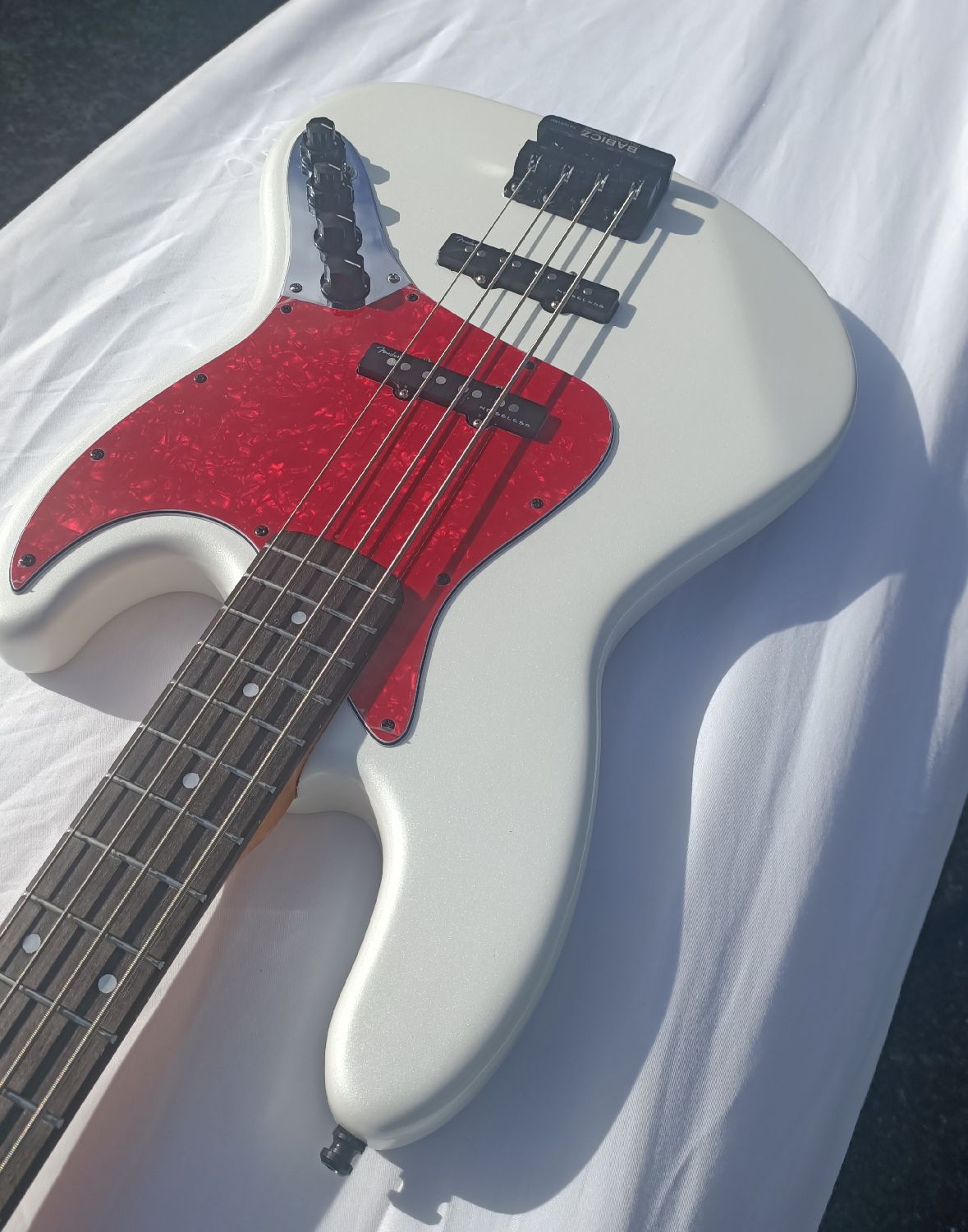 Hardware upgrades , Babicz FCH string through bridge, HipShot USA ultralite machine heads and string retainer, Fender noiseless pick-ups and pre-amp with 18v battery holder. Schaller strap looks and a Graph Tech TUSQ nut.