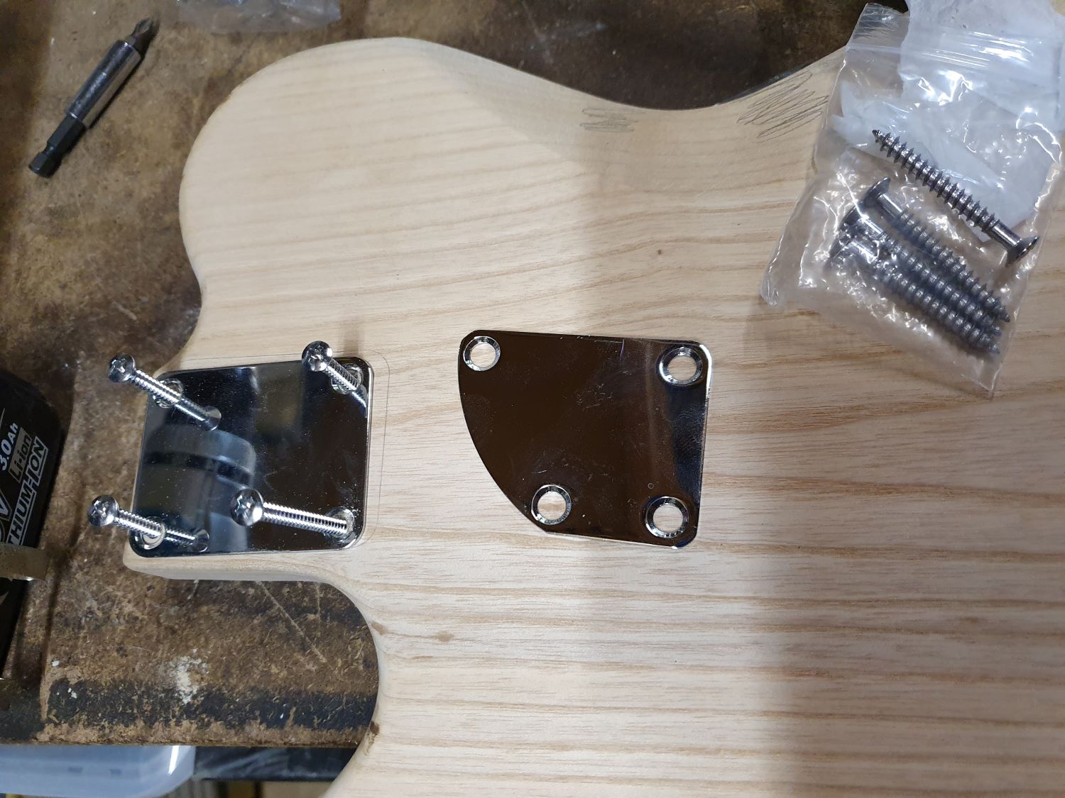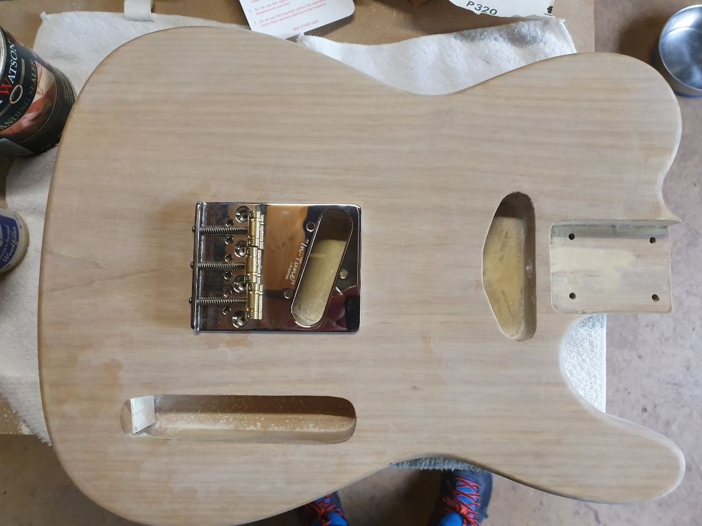 In terms of looks (as you should try to avoid painting in the neck pocket except around the very edges), you could consider filling the gouge, then sticking a piece of ash or maple veneer over the top. It will raise the neck up slightly, but not by much (and you can always sand the veneer even thinner first).