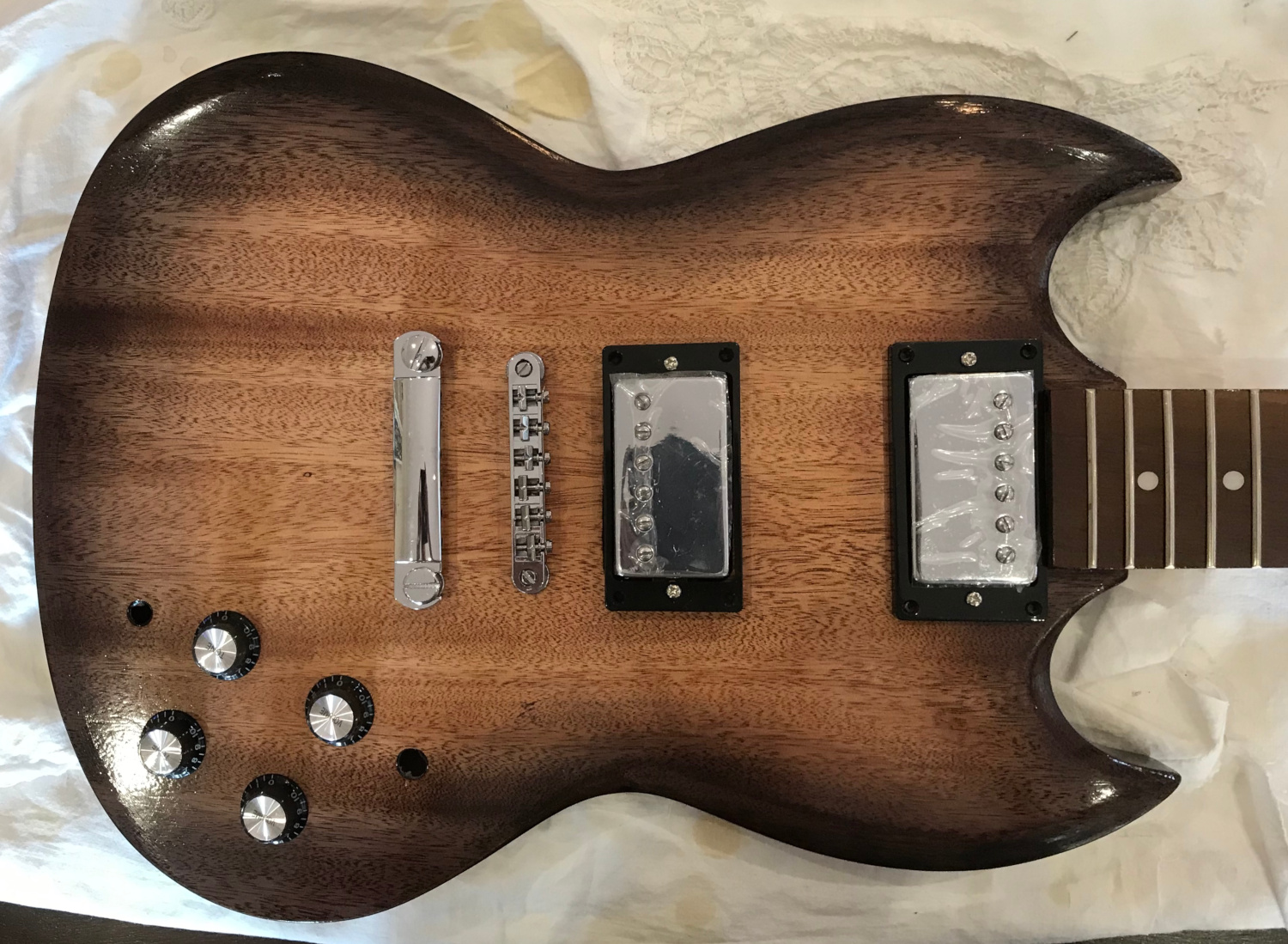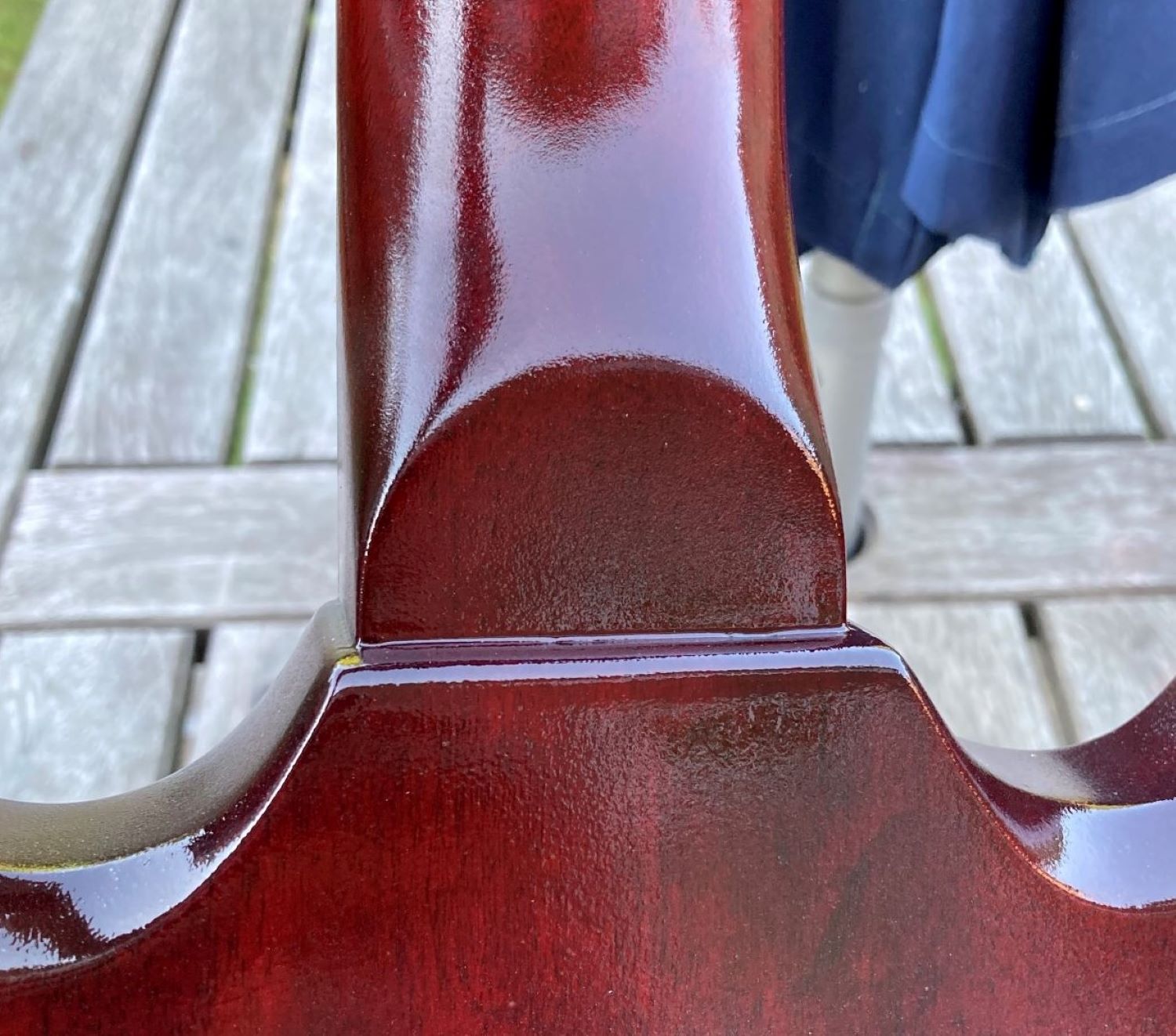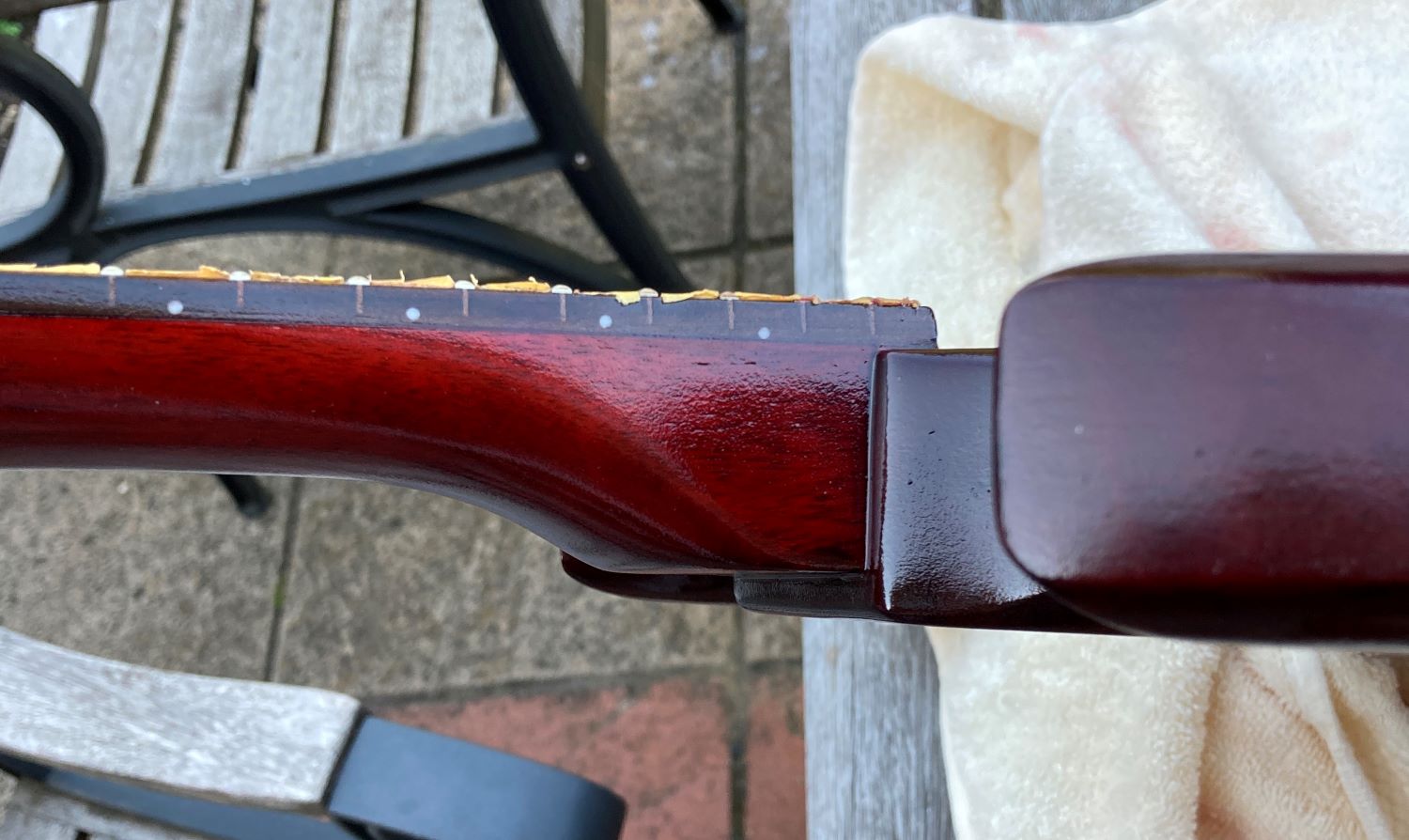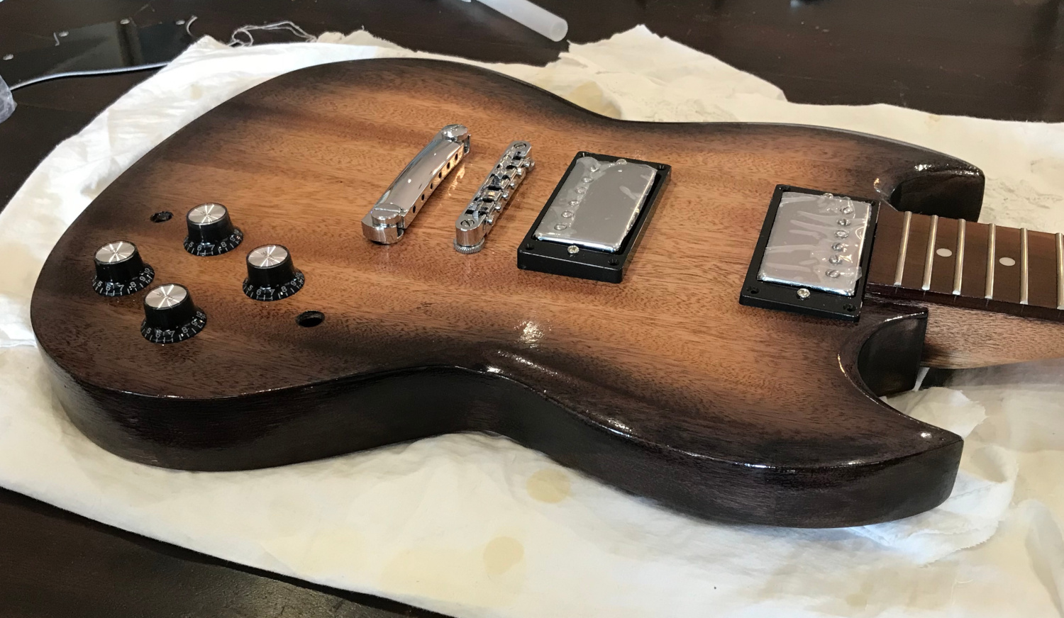 I was aiming for a mahogany / black burst, and I think the black burst part of that worked OK. The mahogany has come out rather pink though. I started with two coats of Feat Watson Mahogany, diluted 1 part stain to 2 parts colour reducer. Then I went around the edges with Feast Watson Black diluted 1 part stain to 3 parts colour reducer, working it in with a separate swab of cloth.