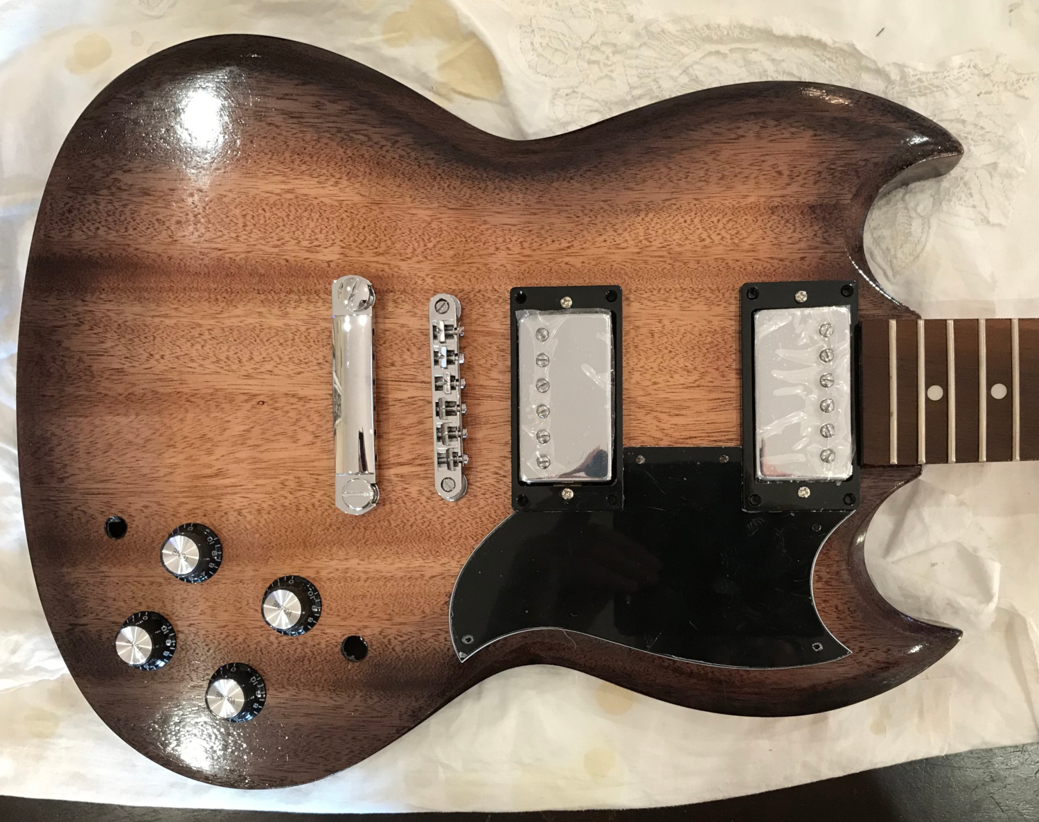 I can't decide whether I'll fit the scratch plate or not. At the moment, I'm leaning towards "not". I also have some chrome pickup rings on their way. I haven't set the neck yet - these photos are a mock build.