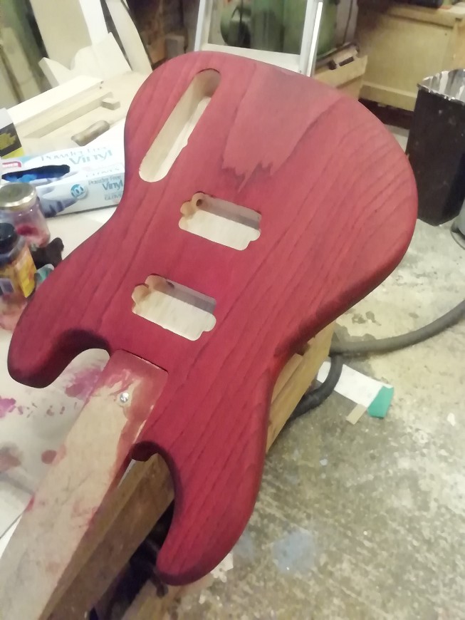 The body is currently getting scraped/sanded back a good bit since the dye revealed all sorts of scratches that I didn't see when it was bare wood. When that's done I'll have to make a decision on colour. The Fiebing's dye is pretty good to use and reasonably economical, but man, I wanted a red guitar and I cannot see what in their range would give me that.