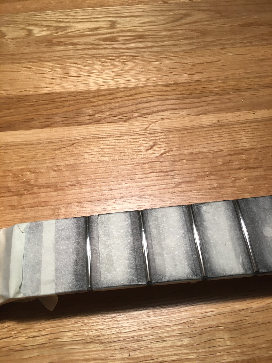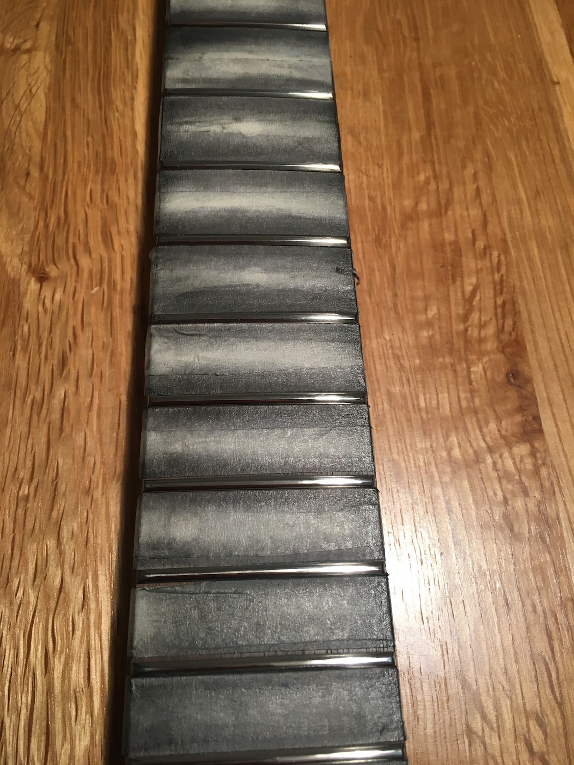 Next up, neck out and fret levelling. Made the neck flat with a notched edge, then loads of masking tape on the fretboard, sharpie marking on the frets, and 360 grit on a long piece of known flat hardwood. Once they were all level, repeat very gently with 600 grit. As you can see in the photo, there was quite a difference between the highest frets and the lowest. Hopefully fret crowning will still be OK, given that some frets are only just flat on the top and some are very flat...we'll see when the newly ordered fret-crowning file arrives!