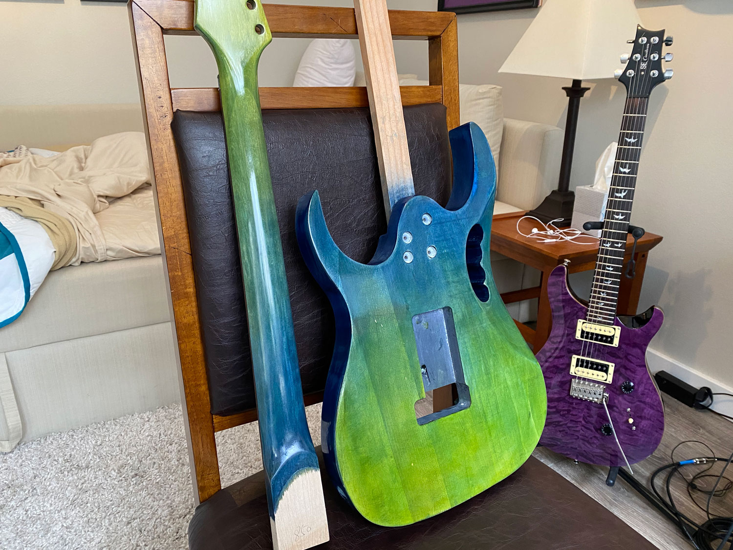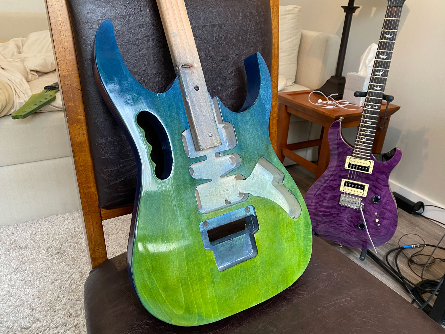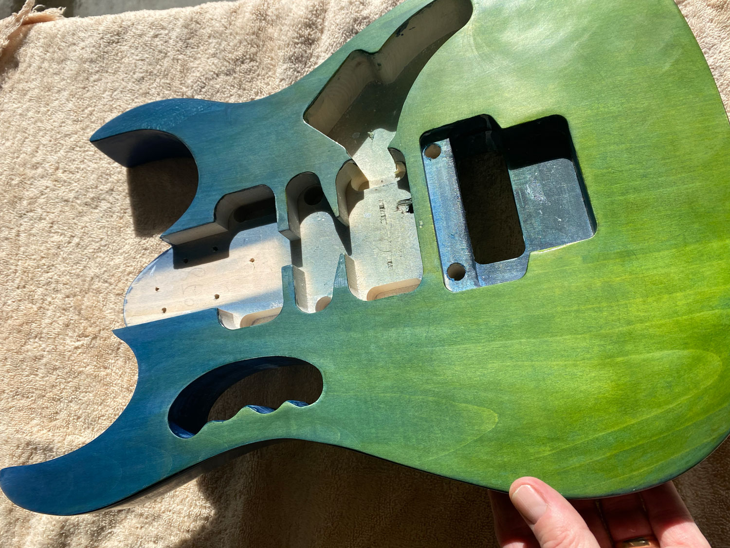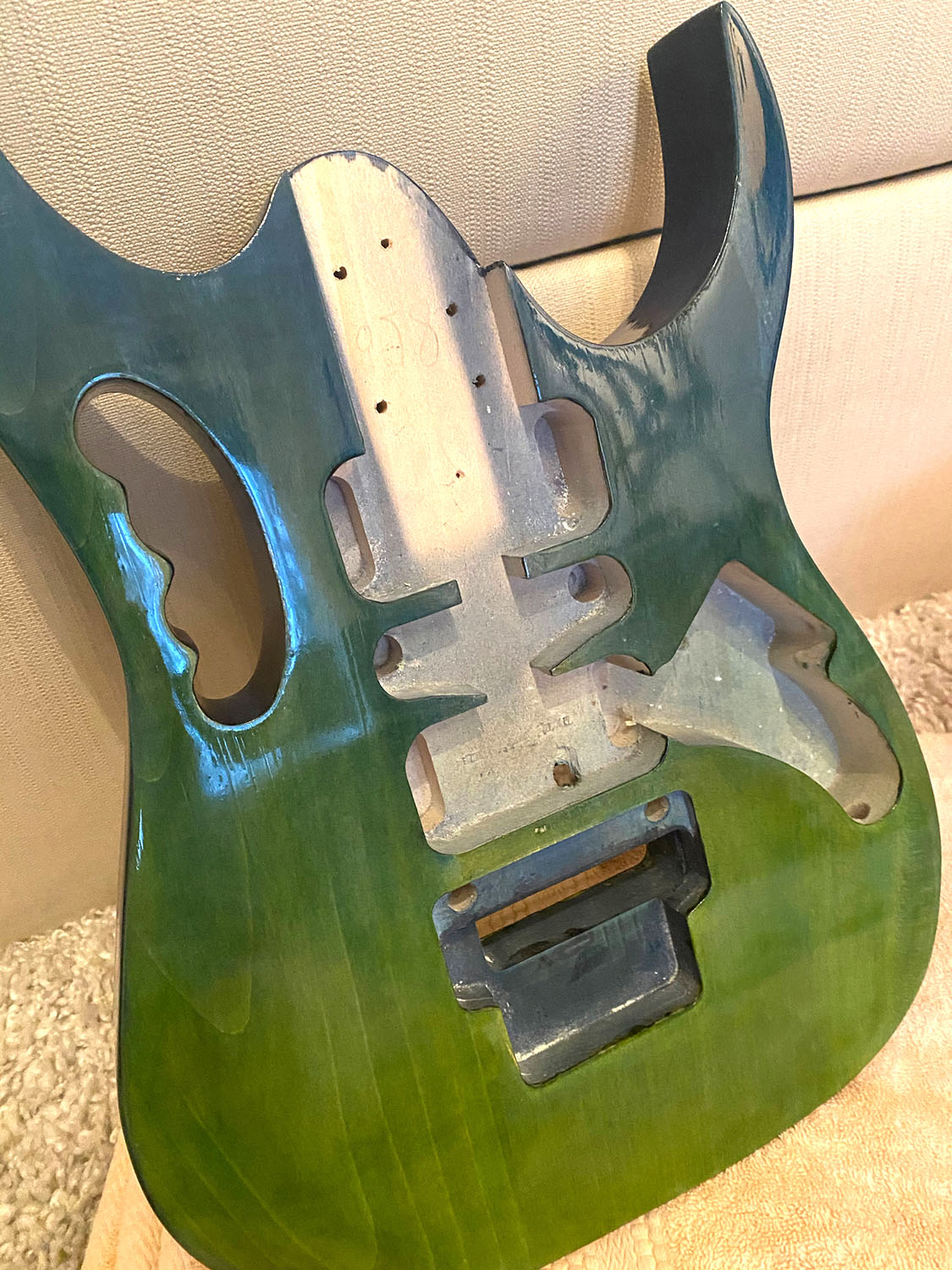 Final buff and polish done. Bolt-on neck attached, Grover locking tuners installed and copper tape put in all the cavities.