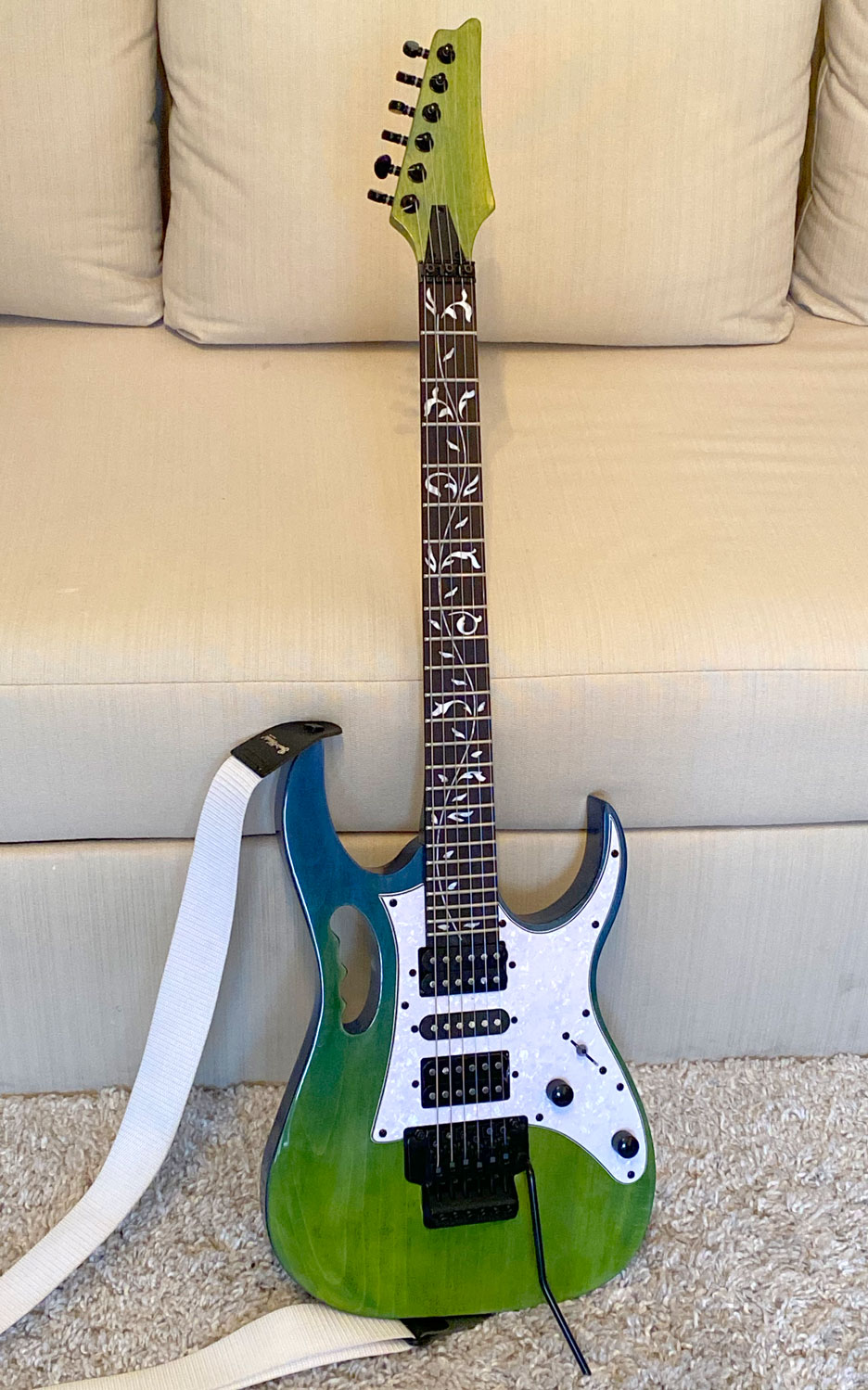 The Floyd Rose took a while to set up going back and forth but works fine now. Not sure what I've messed up with the wiring but it sounds like hell when I plug it in. Just loud noise. I need to check the jack. Maybe something came loose? Aside from that, job complete!