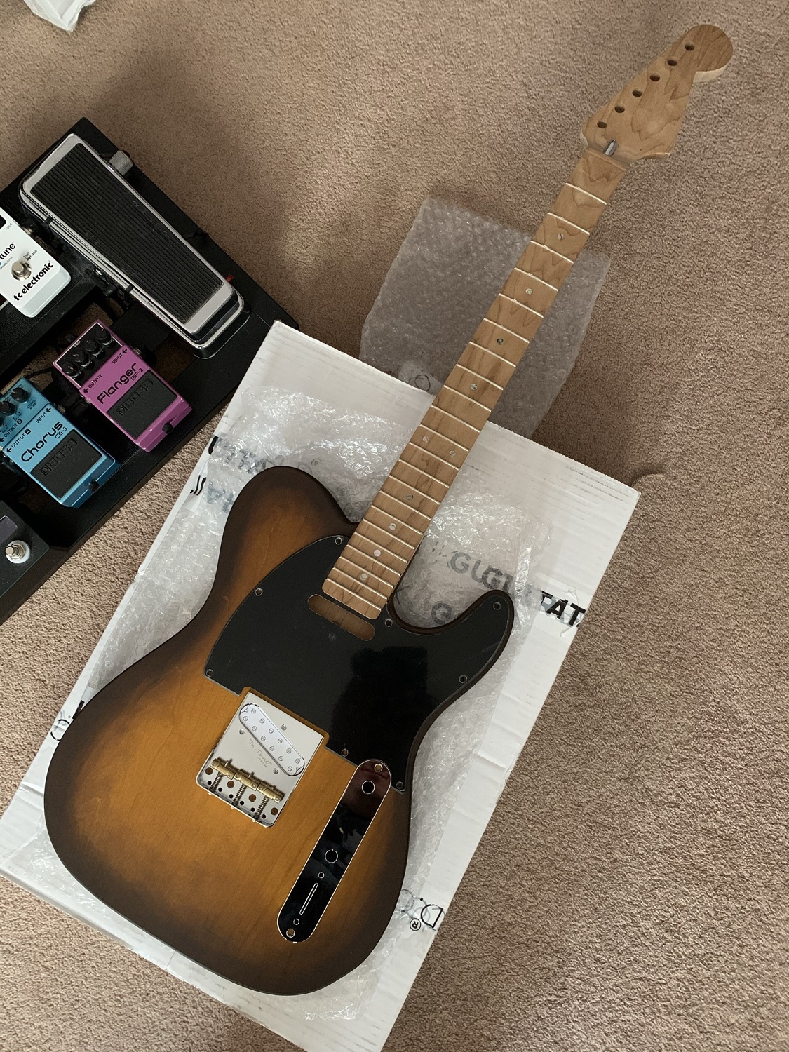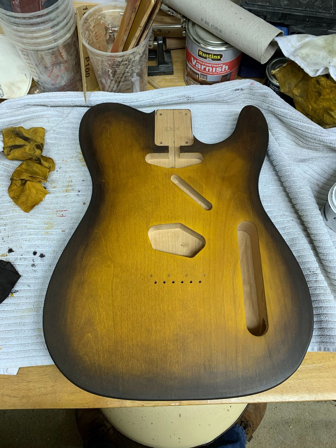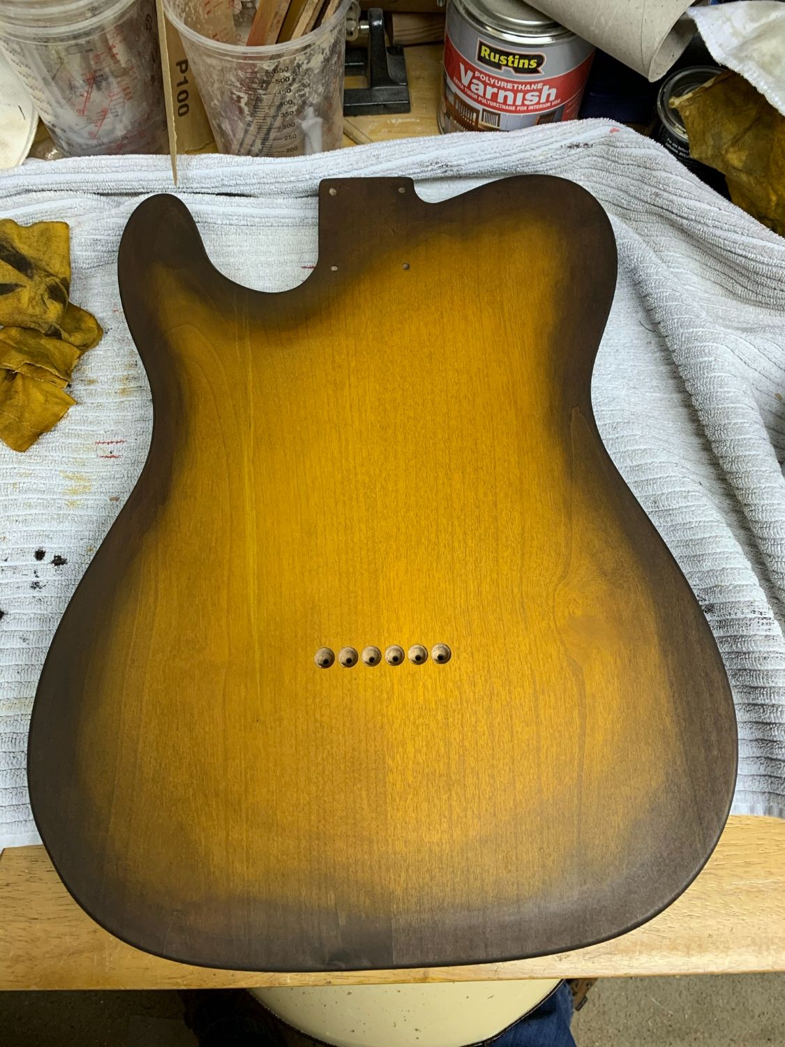 With the alder body, I would suggest using a pre-stain conditioner (sometimes called anti-blotch something-or other). Alder can be hit or miss with how evenly it takes up stain. My last strat build (non-PBG) I wanted to do a blue dye/natural finish on alder and I didn't do anything apart from sanding before dyeing. There just one stubborn spot on the front that I just could not get to balance. (however the back was bloody perfect! D'oh!!!)