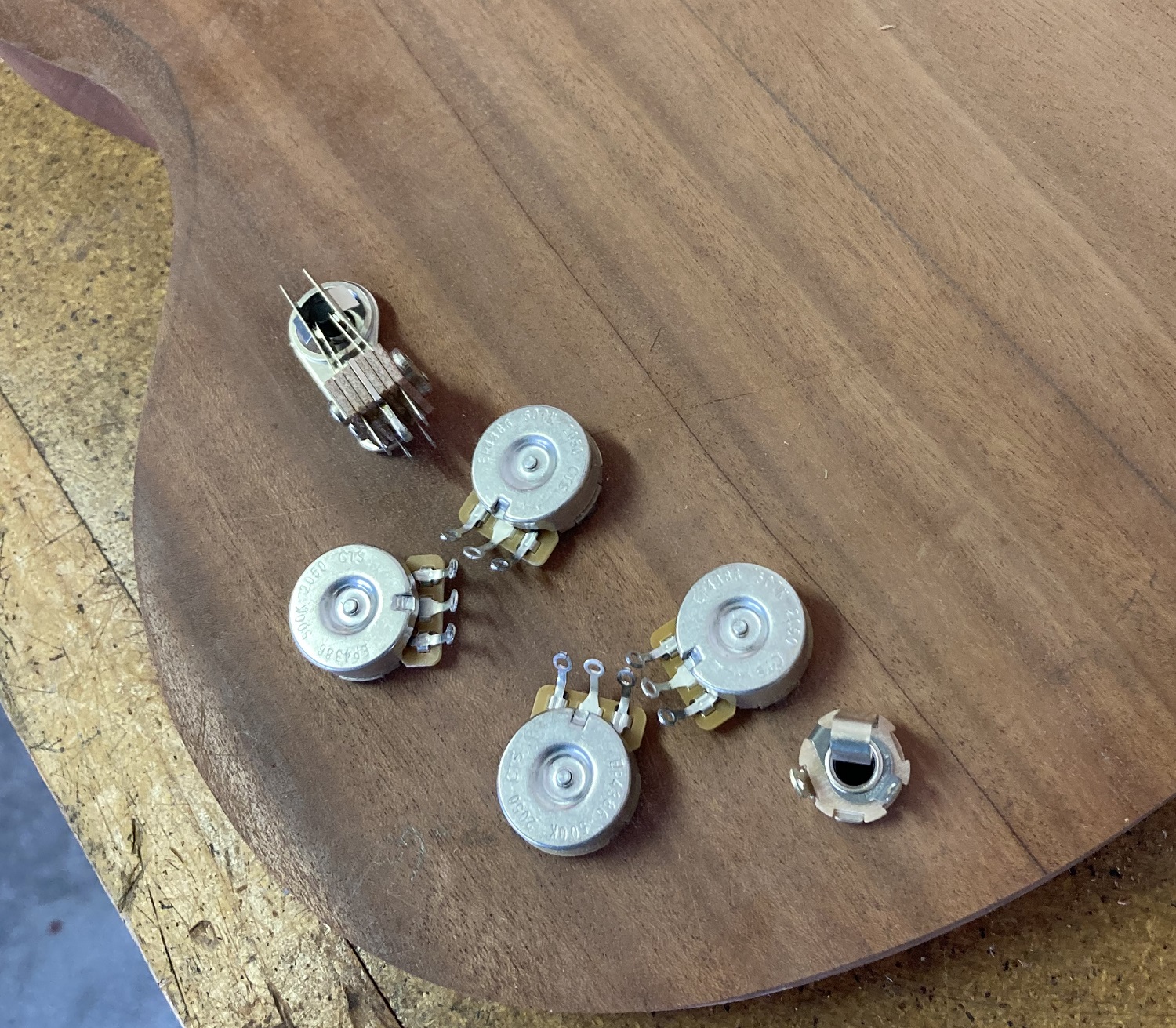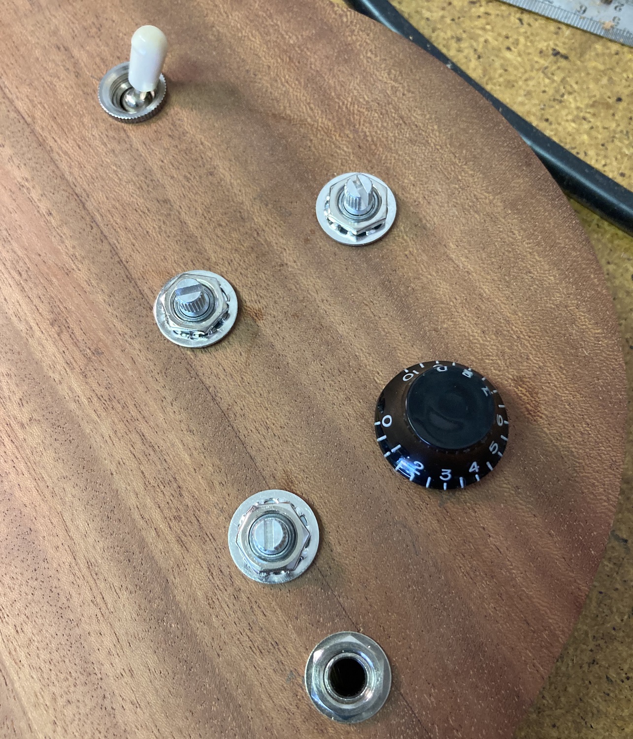 I first drilled the holes for the components from top down then checked that the plan cavity was OK. I think the design had planned to use mini pots although it didn’t say. I had to expand the cavity a little to fit the full-sized pots included in the AllParts SG electrics kit I had purchased