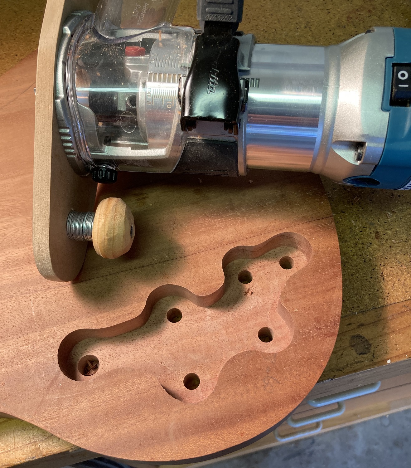I've yet to make a flat plate for the Makita alone. I have got the plunge router base for it, which is wide enough to bridge most gaps on the guitar body, but visibility is much reduced, so you're reliant on the follower bit doing its thing. Had I had just the palm router with a small baseplate so I could see the bit, I wouldn't have done so much damage to the pickup rout floor on the GST-1.