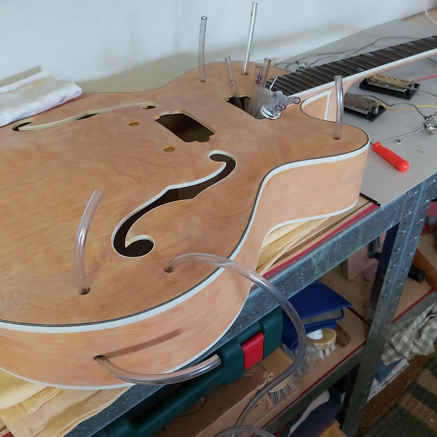 Another productive day managing to get all the wiring inserted and pots screwed in place. Old trick with the jack and string/washer did the job and yes I did have a problem getting the 3-way sw inserted (had to remove the inner nut to allow enough thread to poke thru the top) and a few more cuts and scrapes to the hands. Then the miracle of the ground to bridge post sight unseen (absolute fluke I think). So it's all wired up and just hoping it all works eventually! Will let it lie for a day or two whilst I get a few more bits of myself removed courtesy of carcinomas - speaking of which where is the bloody sun? We're drowning!:D