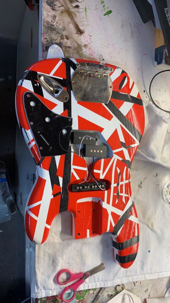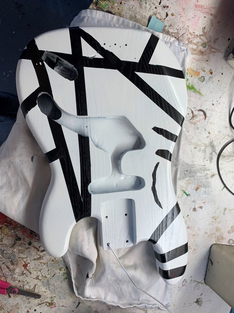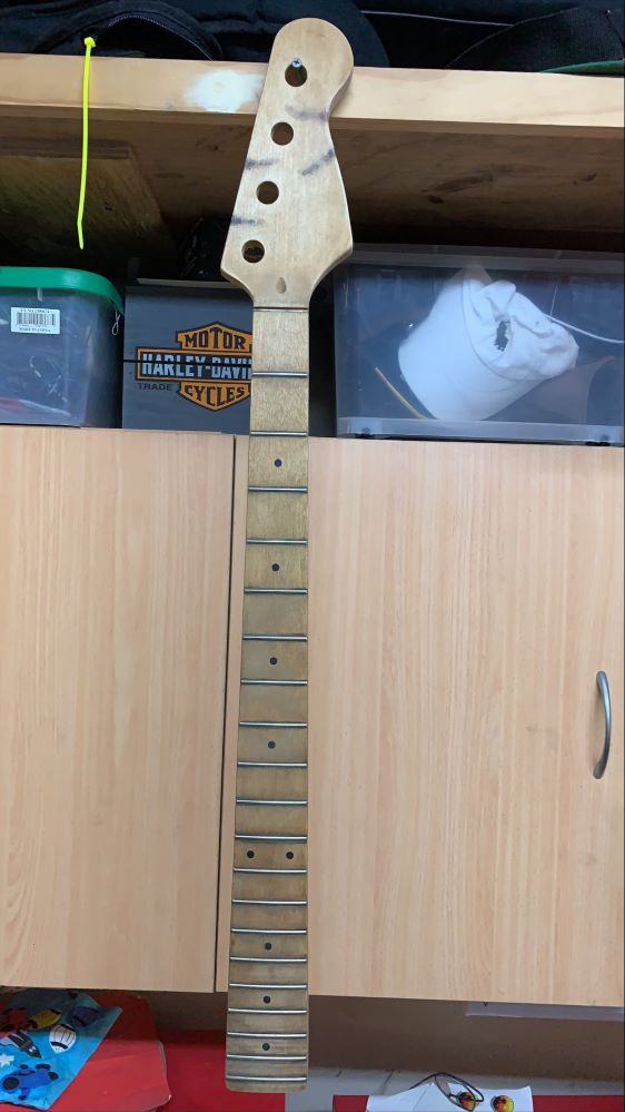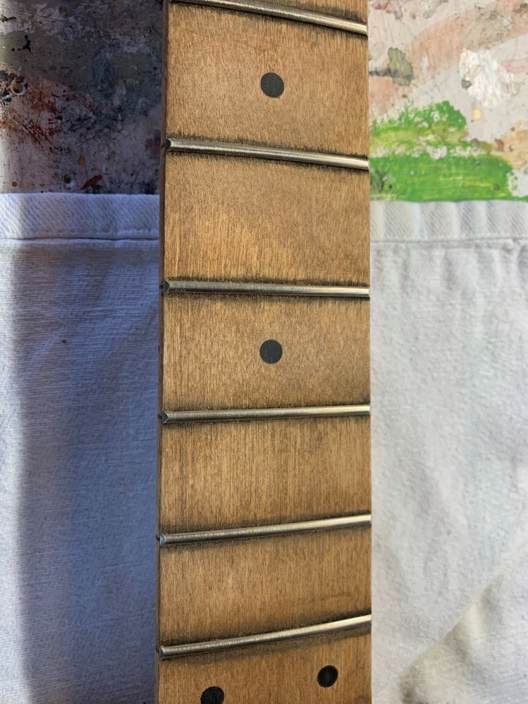 A good covering with watered down black paint, instant coffee (smells nice!) and garden dirt transformed the nice new maple neck into this. It dried overnight and then had a light sand with #600 to make it silky smooth and feels superb.