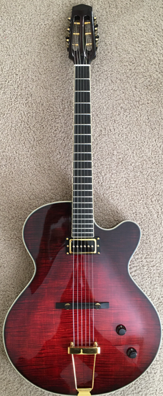 This is the guitar I would go to at the music shop. The finish suits the style and is really well done - I love the deep red colour and the burst, and the way the grain is subtly eccentuated by the darker stain. The simple black (?) back and neck are well done (which isn't easy with black.) That's set off by clean binding. The headstock shape is ambitious and yet well done, though I would like to have seen a logo. Hardware choice, especially the floating bridge, completely fits the style. All round, a stunning guitar.