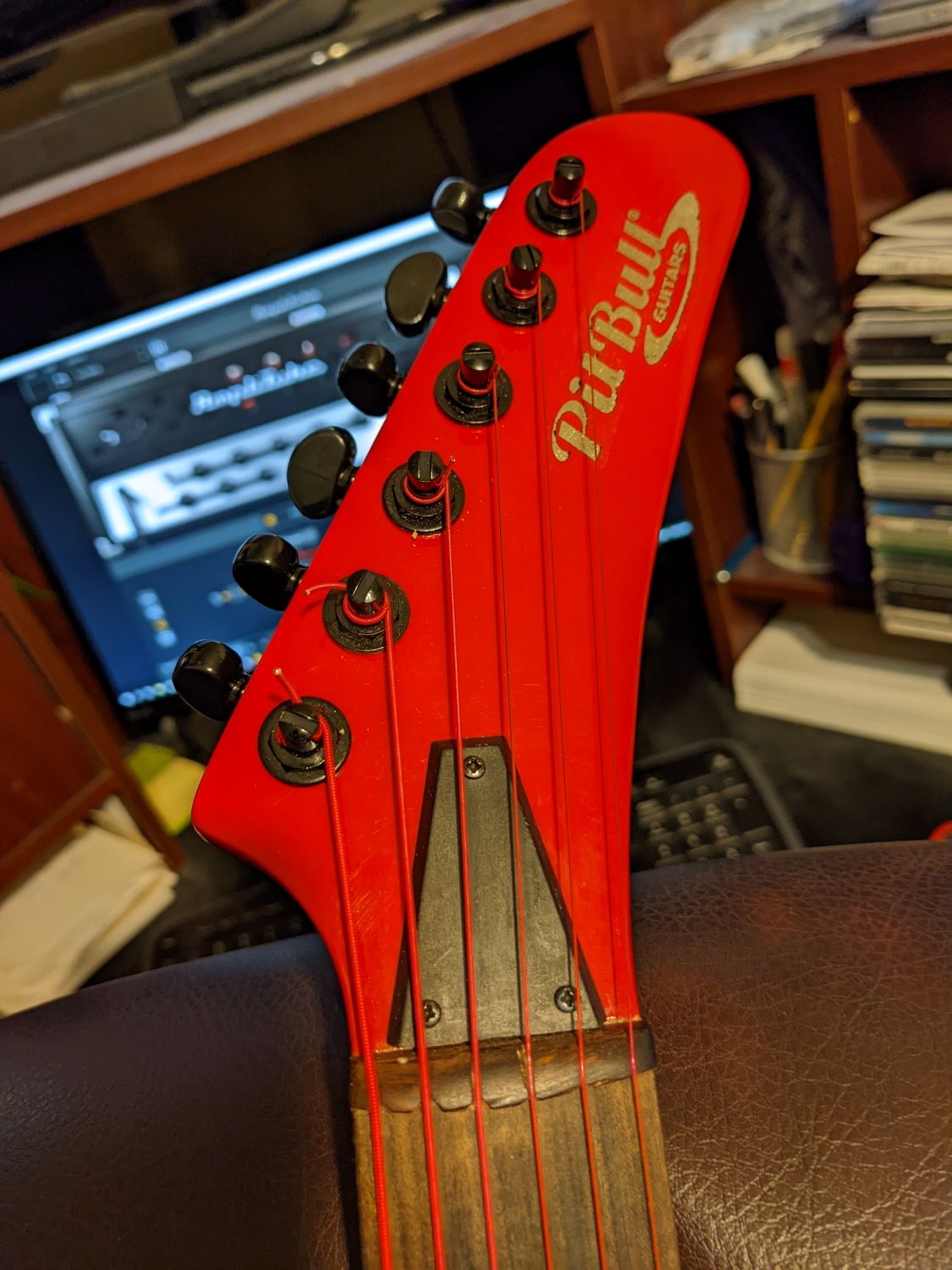 This screams "metal" down to the black hardware and colour co-ordinated strings. I love how the red finish is really bold, but still shows the grain. Great choice of hardware, especially for the genre. I didn't know compensated nuts were a thing, but there you go ;-) It looks like the finish in the headstcok doesn't quite extend all the way to the nut, but again, I'm being picky.
