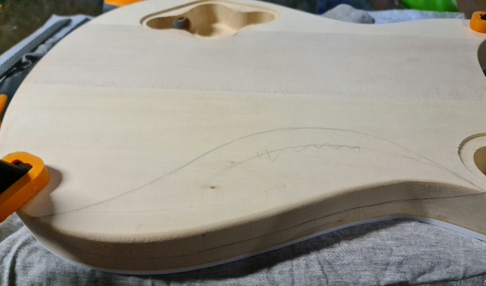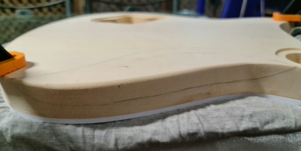 Then started prep work on body. I drew approx shape I wanted for belly curve and started shaping.
