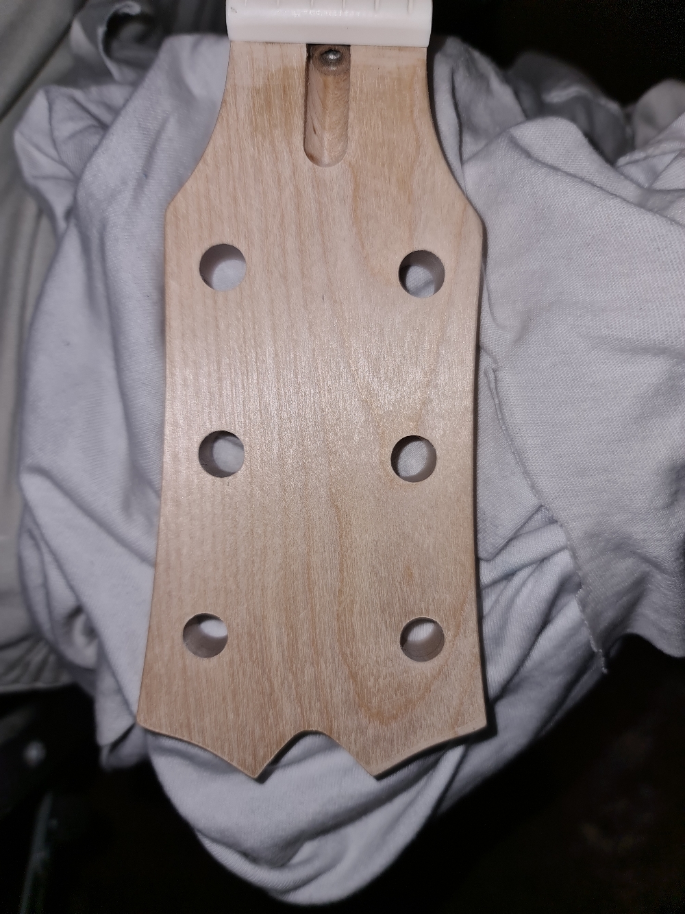 Removal was pretty easy, was alot of glue though. So cleaned it all up, and glued in the bone one with a very small amount of the neck glue. Taped the nut, and have it setting to work on tomorrow. I also roughed out a headstock shape. Which will be part of tomorrow's job to cut and prep for oil.