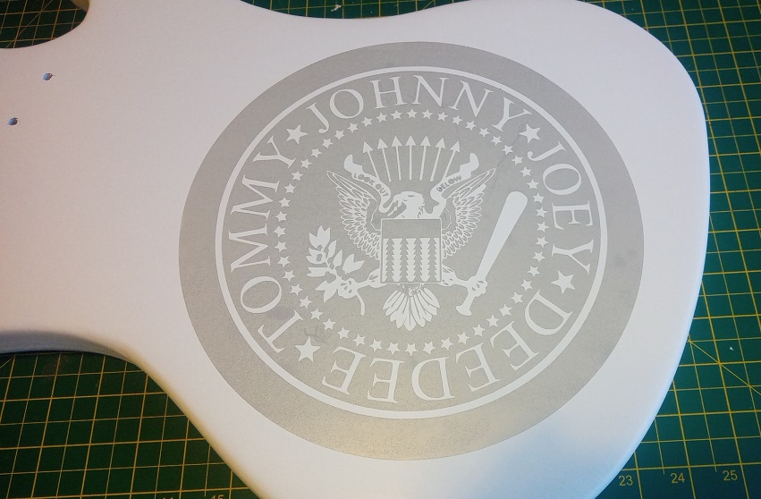 I cut a self adhesive stencil of the Ramones Seal for the back...