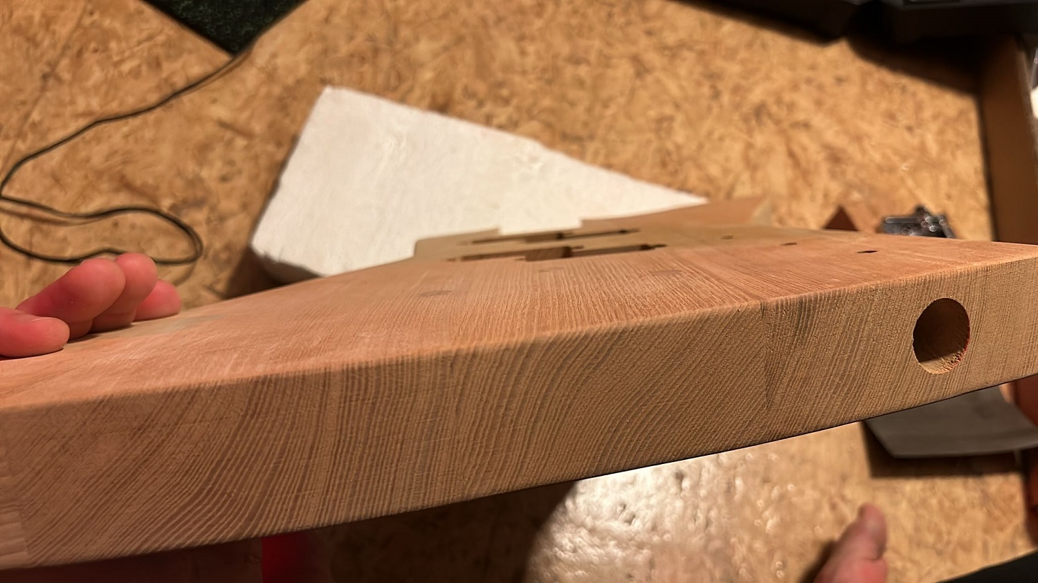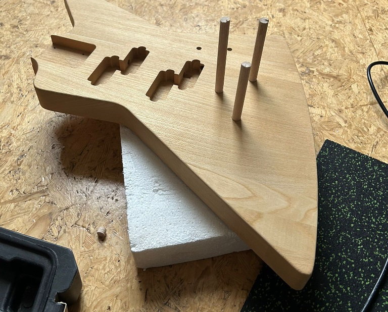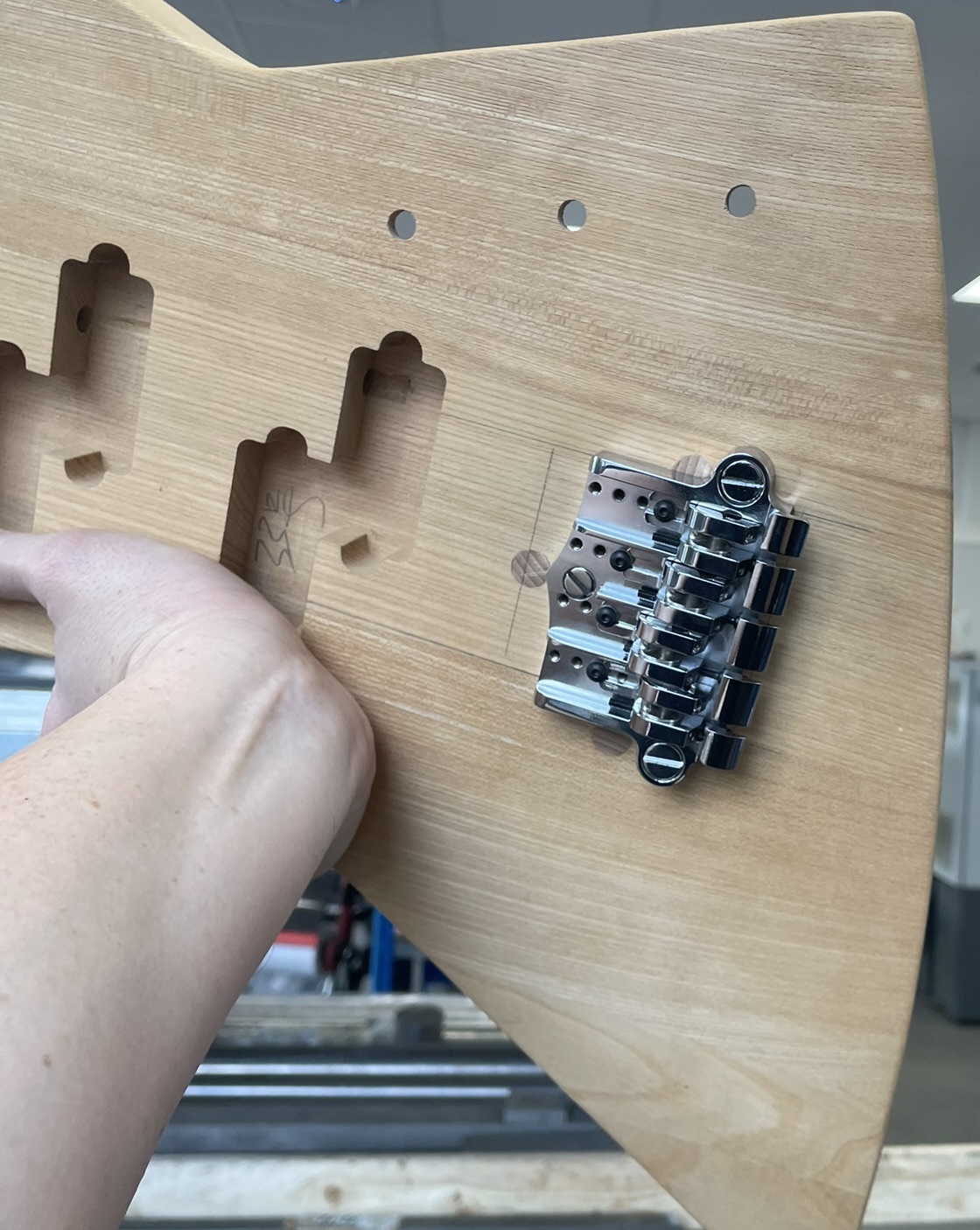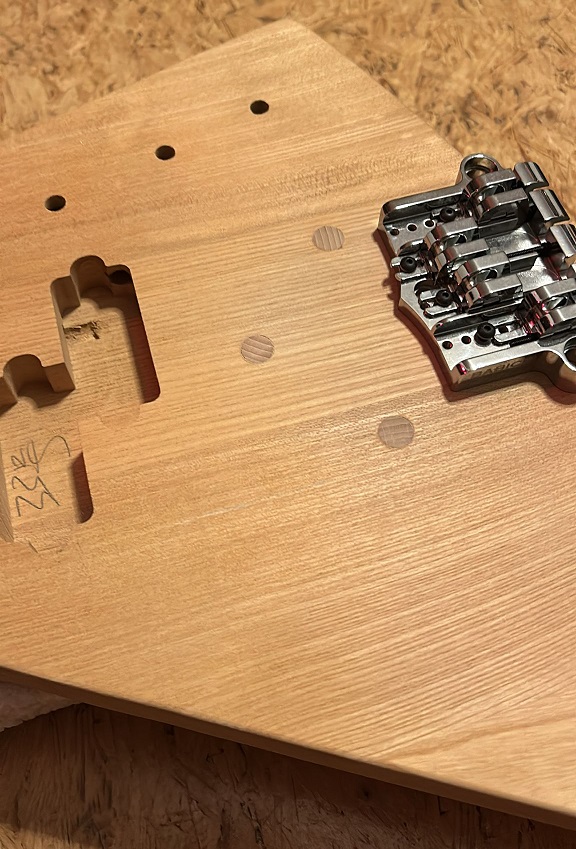 More Glück im Unglück ;-) ...The need to reposition the bridge leads to the opportunity to realign the bridge. If you are doing a non-transparent finish on a solid body, there is really no down side to the plug-and-sand approach. I have more experience with this than I wanted... This is how I plugged the holes the first time: