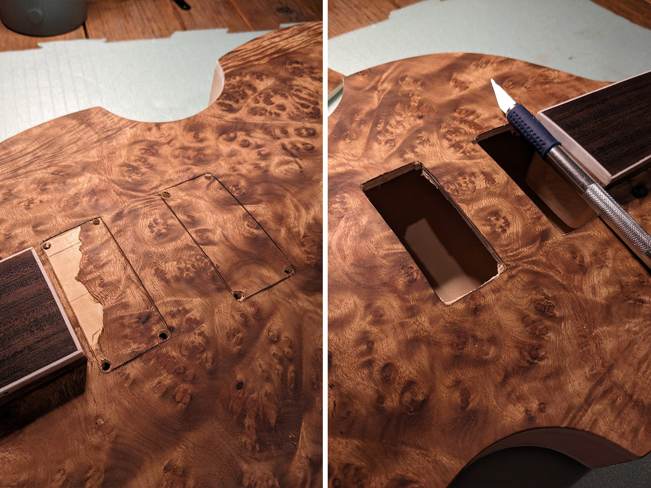 After reparing all the cracks and broken parts of the veneer I went on cutting the Humbucker cavities, using a scalpel knife...
