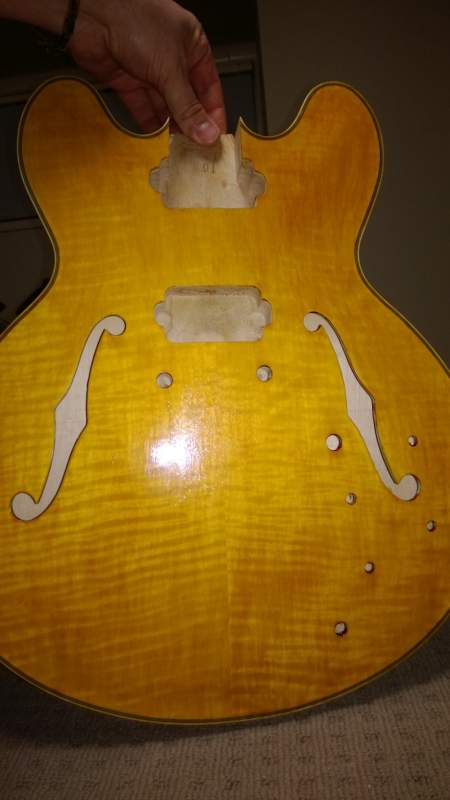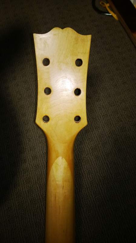 Got quite a few more layers of Shellac on the top of the guitar this weekend, and also shaped the headstock into a familiar looking shape using a coping saw.