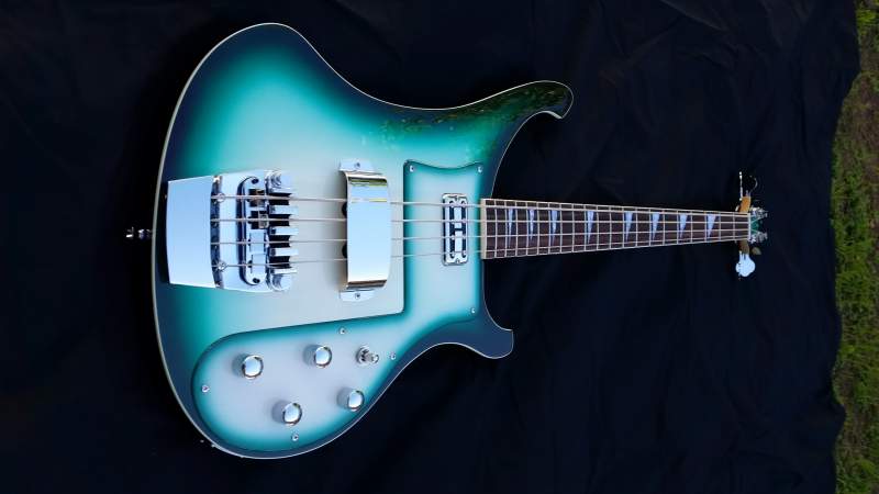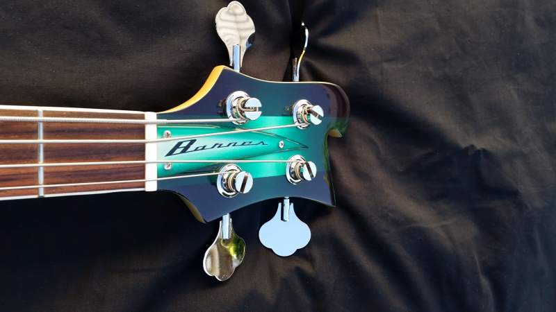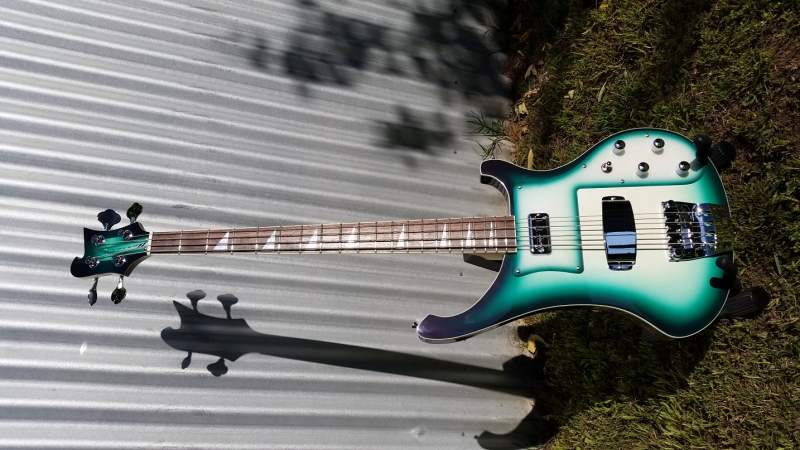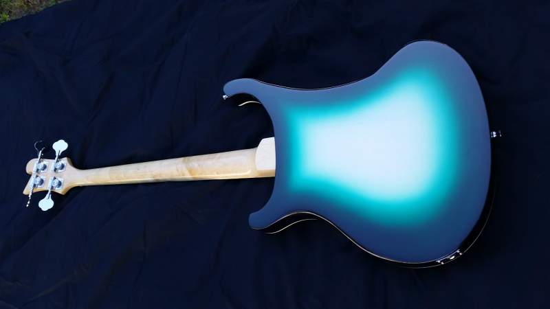 Mostly standard kit with Fender Fideli'tron and Entwistle JBXN pups, Allparts Ric bridge, modified pickguard and truss rod cover, chrome switch and knobs, bone nut, finished with water based dyes and Tru-oil.